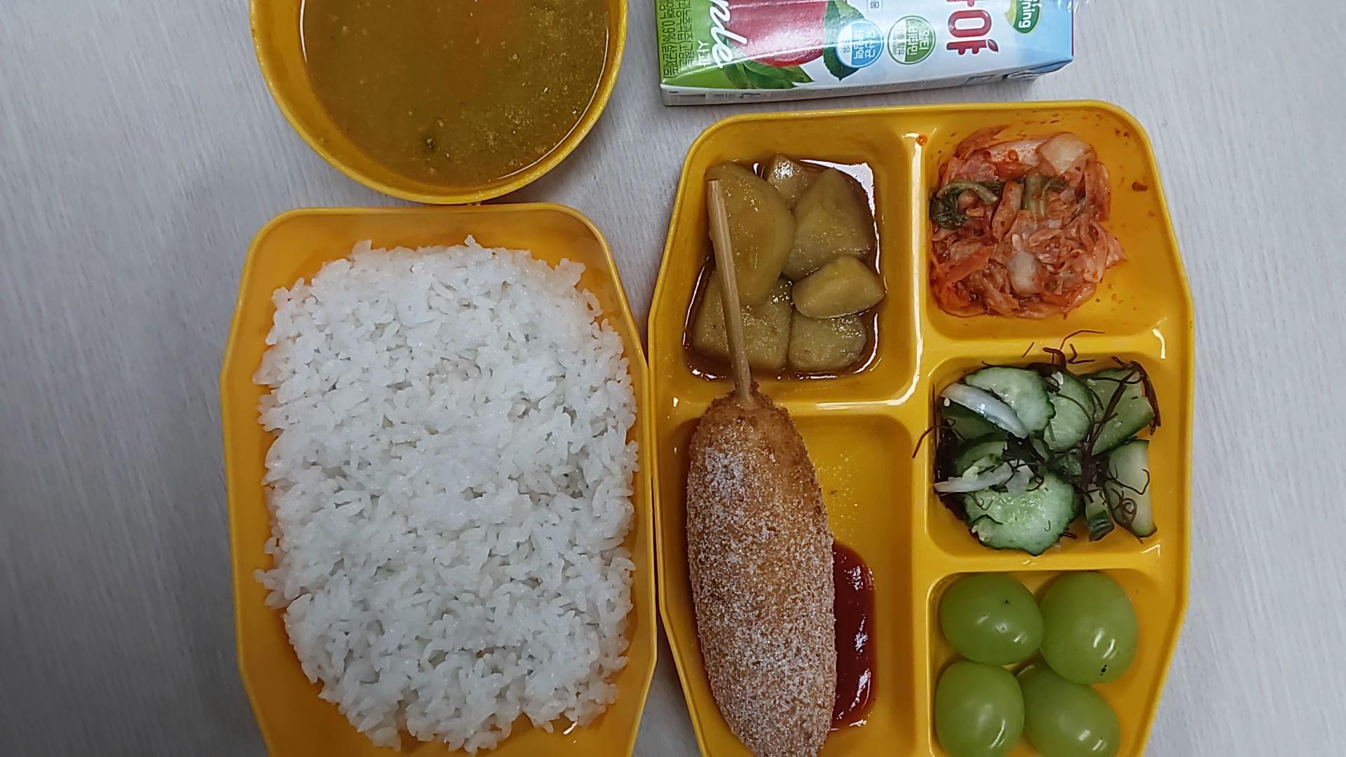 백비밥, 카레소스, 핫도그/케첩, 꼬시래기오이무침, 고구마엿장조림, 과일, 배추김치, 음료