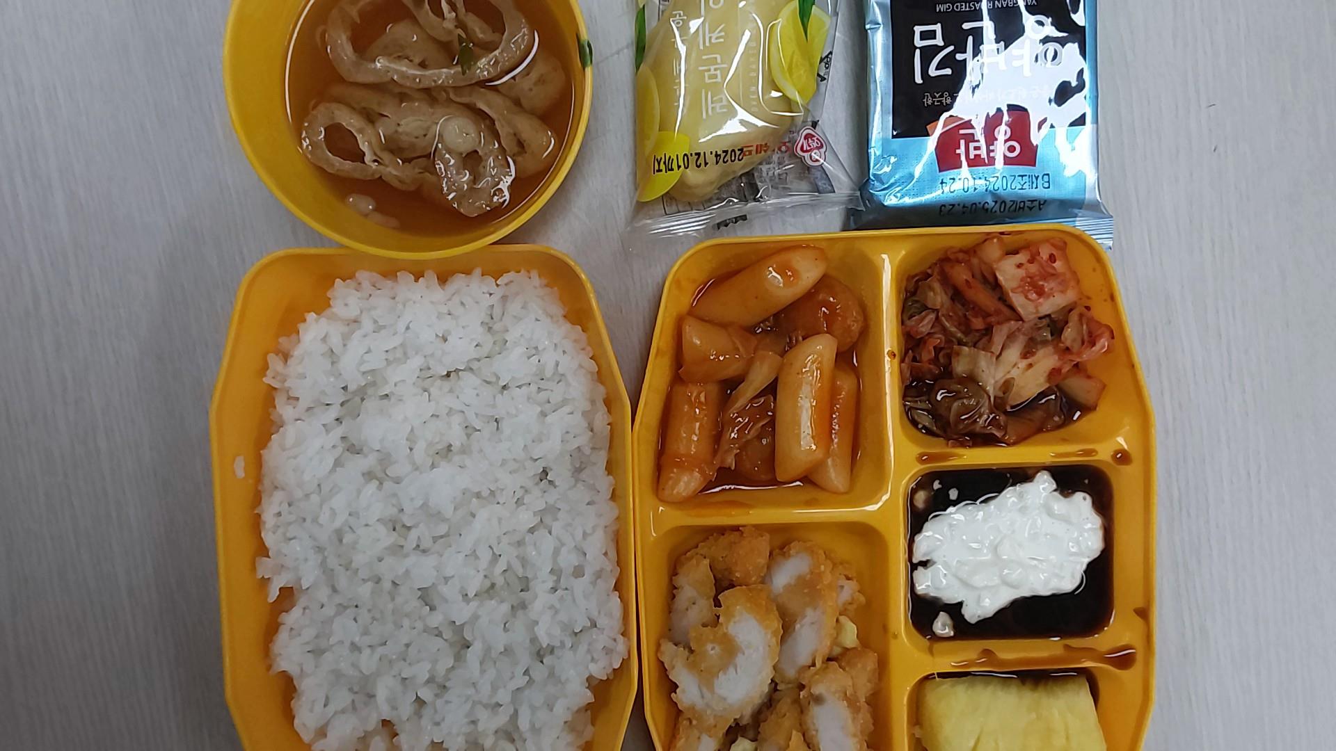 치킨마요덮밥, 유부장국, 매콤떡볶이, 배추김치, 과일, 도시락김, 레몬케이크