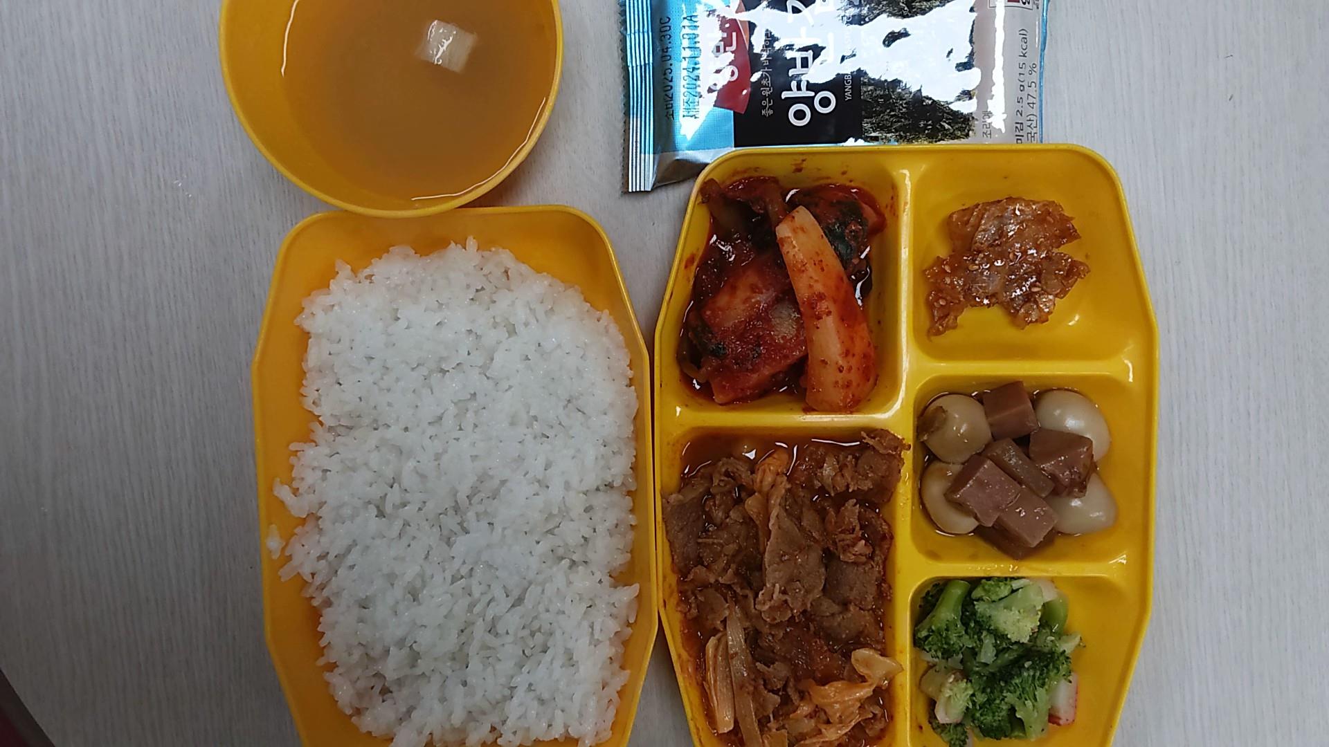 백미밥, 팽이된장국, 돈육김치두루치기,브로콜리볶음, 쥐어포무침, 메알곤약조림, 알터리김치, 도시락김