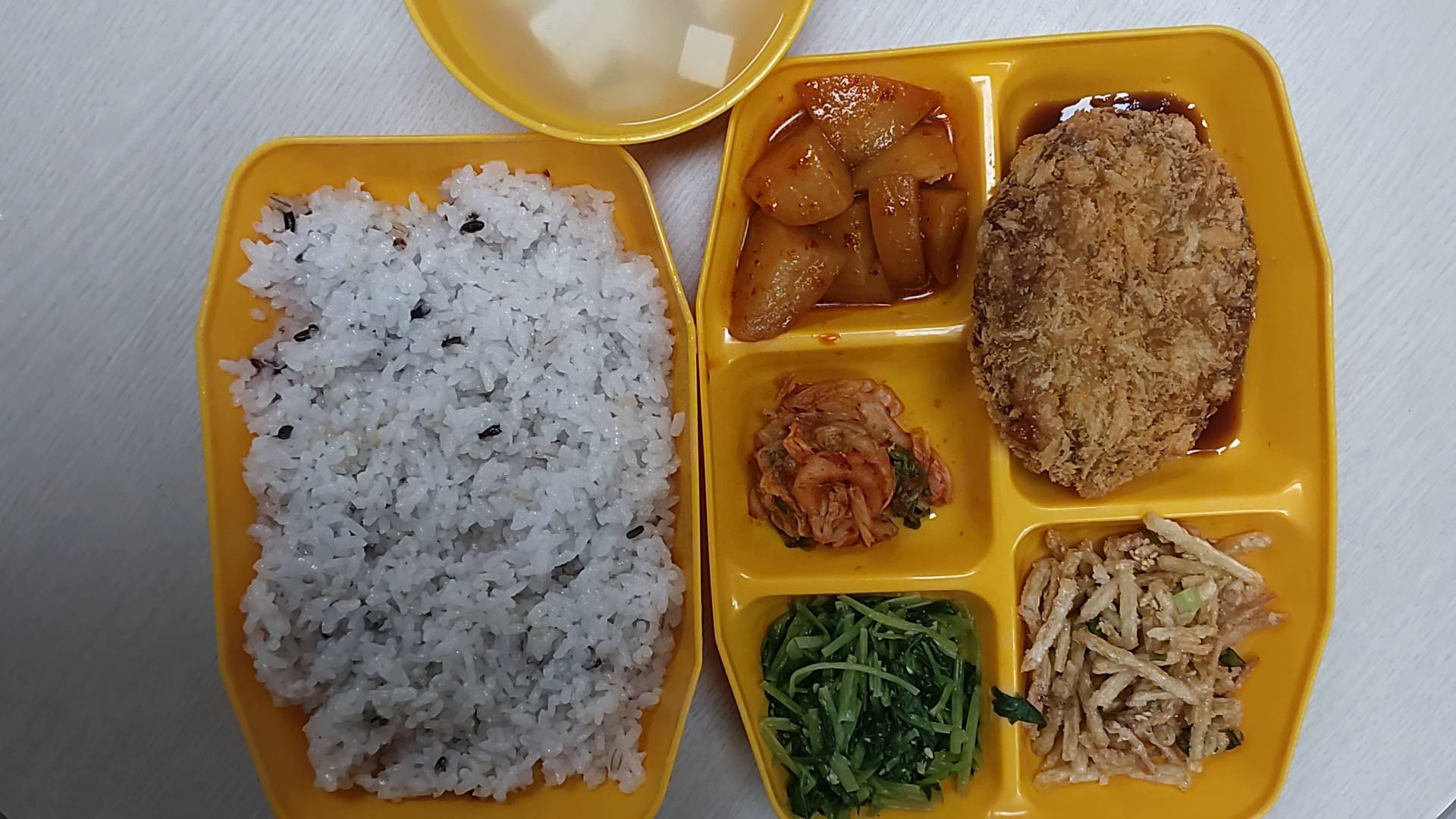 잡곡밥,북어두부국, 멘치까스/소스, 감자고추장조림, 우엉강정, 참나물된장무침, 배추김치