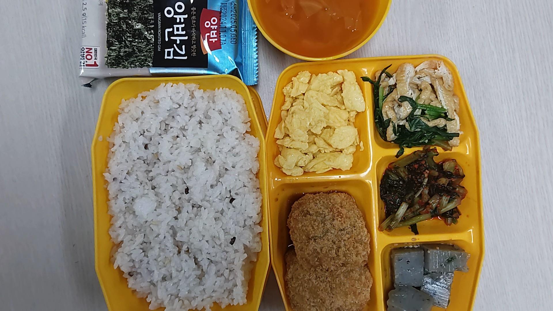 잡곡밥, 순두부김치국, 돈육잡채카츠, 스크램블에그, 검은깨올방개묵무침, 시금치유부무침, 열무김치, 도시락김