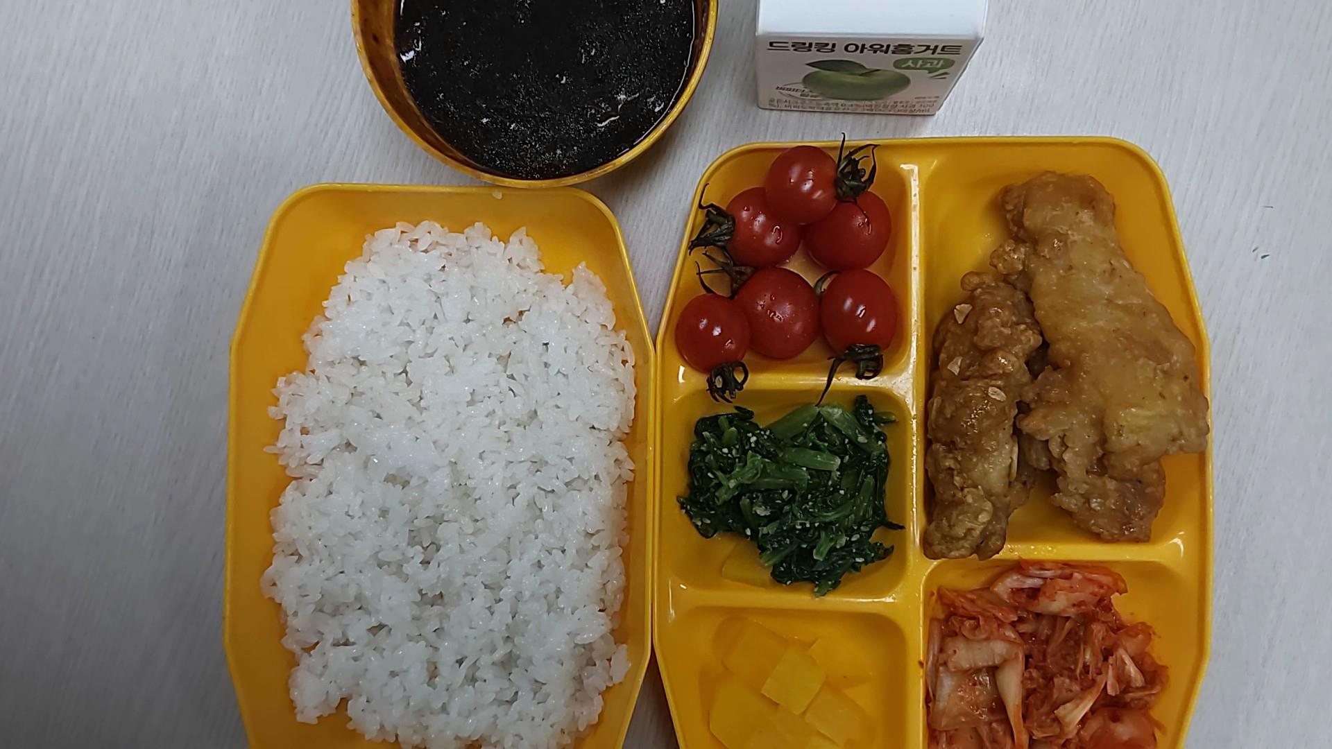 백미밥, 짜장소스, 간장마늘치킨, 열무된장무침, 단무지,과일, 배추김치, 요구르트