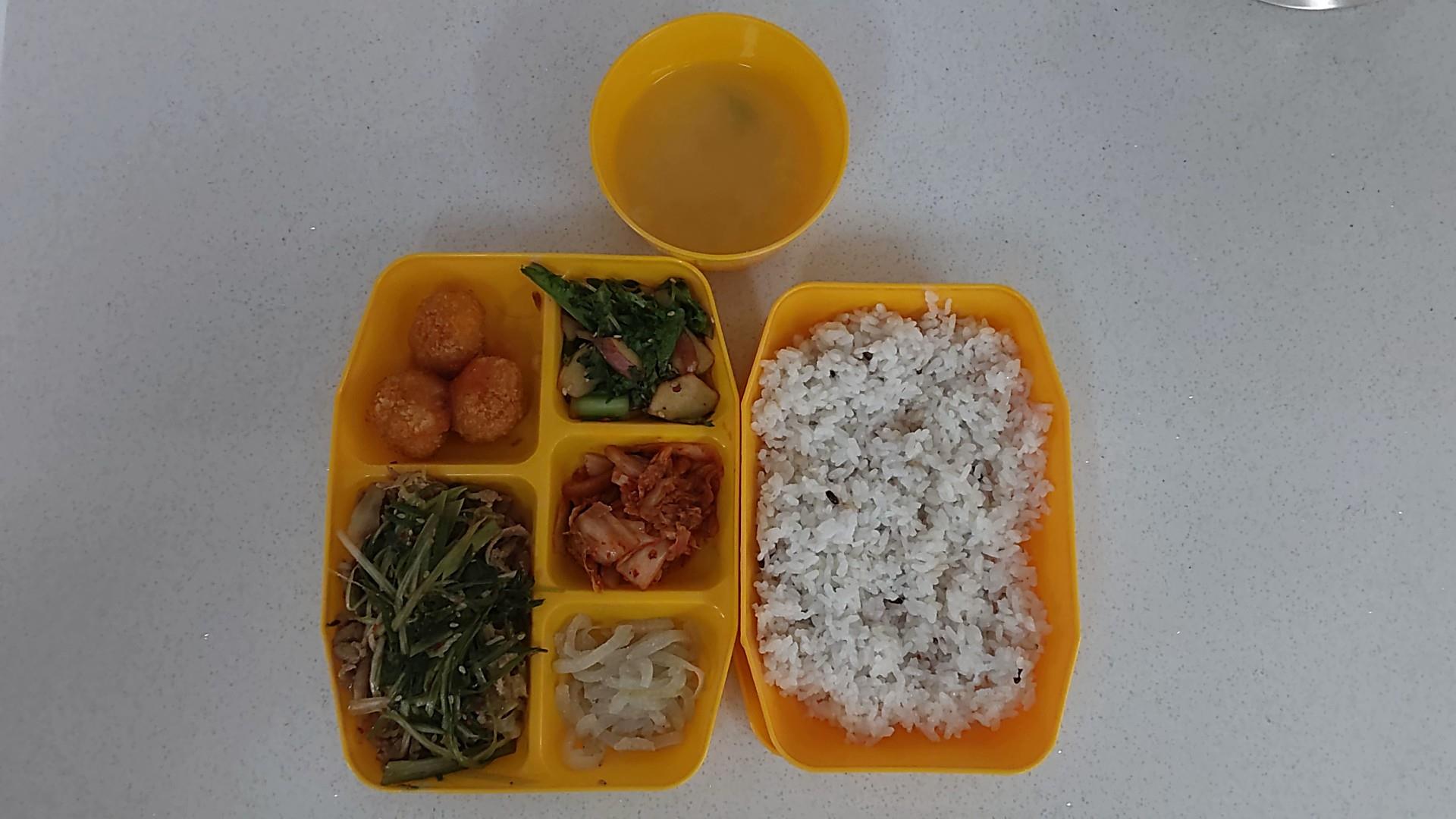 11월27일 잡곡밥, 계란파국, 백미밥, 새우볼/칠리소스, 무숙채나물, 돌나물사과무침, 배추김치