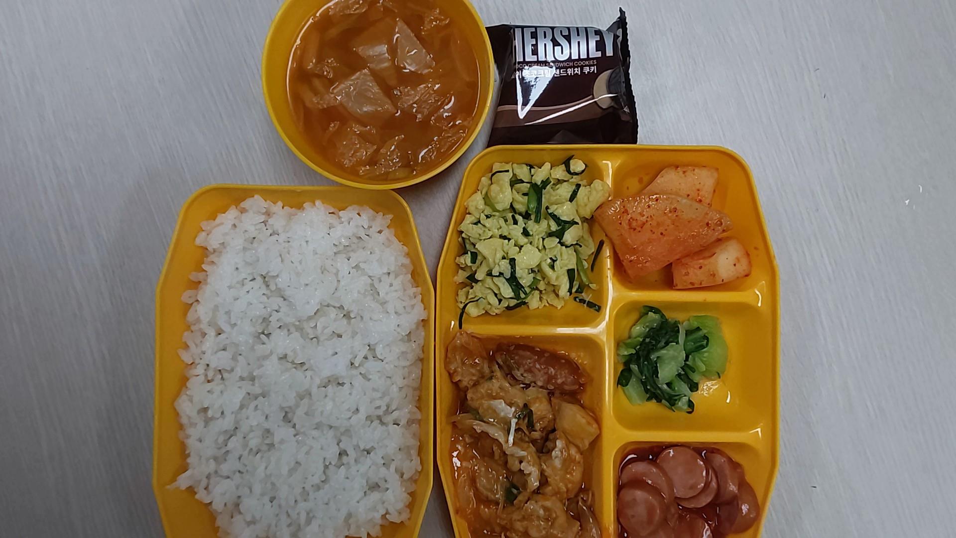 11월28일 백미밥, 김치어묵국, 치즈로제찜닭, 후랑크케찹볶음, 청경채된장무침, 부추달걀볶음, 석박지, 초코샌드쿠키
