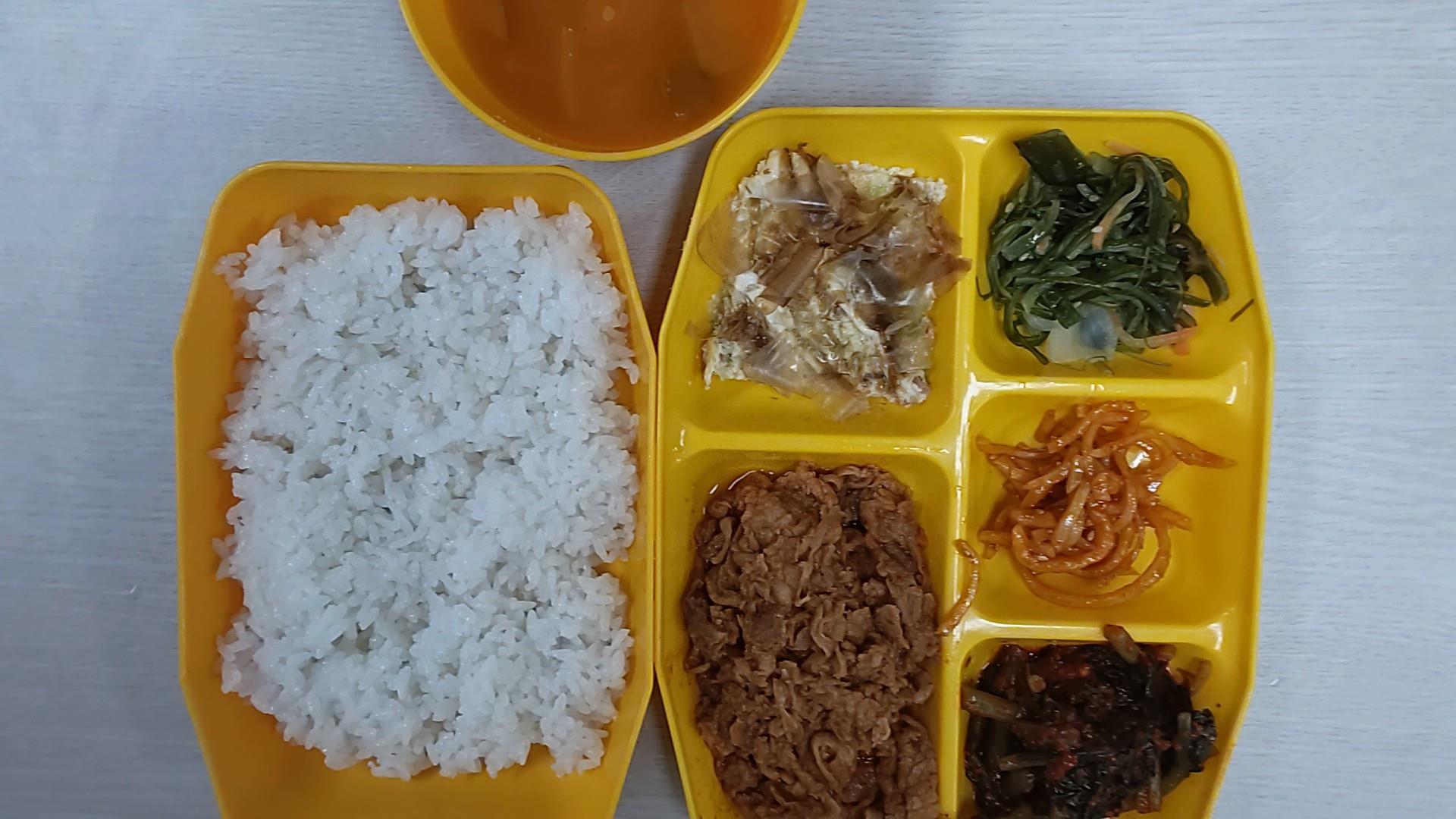 백미밥, 순두부찌개, 제육볶음, 계란두부오코노미야끼, 진미채무침, 미역줄볶음, 열무김치