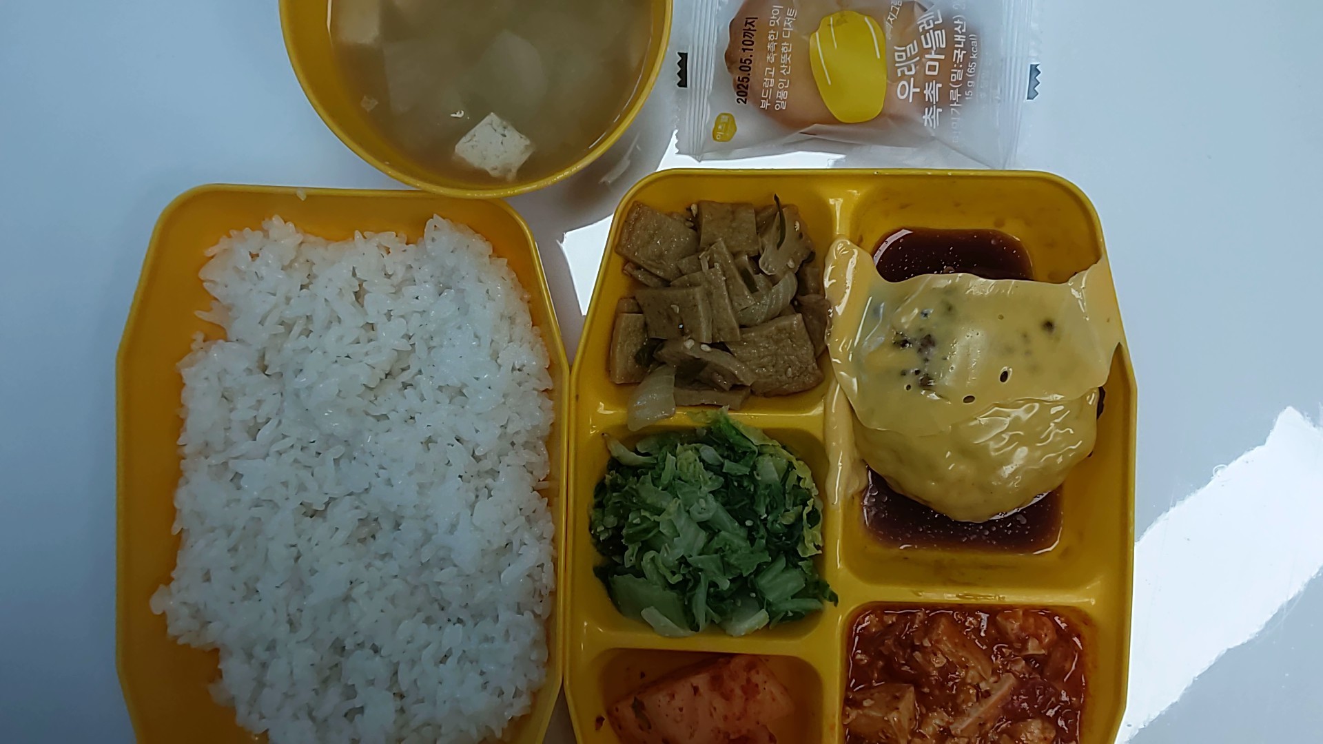 12월24일- 백미밥, 해물된장국, 치즈함박스테이크, 두부매콤조림, 어묵볶음, 봄동나물, 석박지, 마들렌