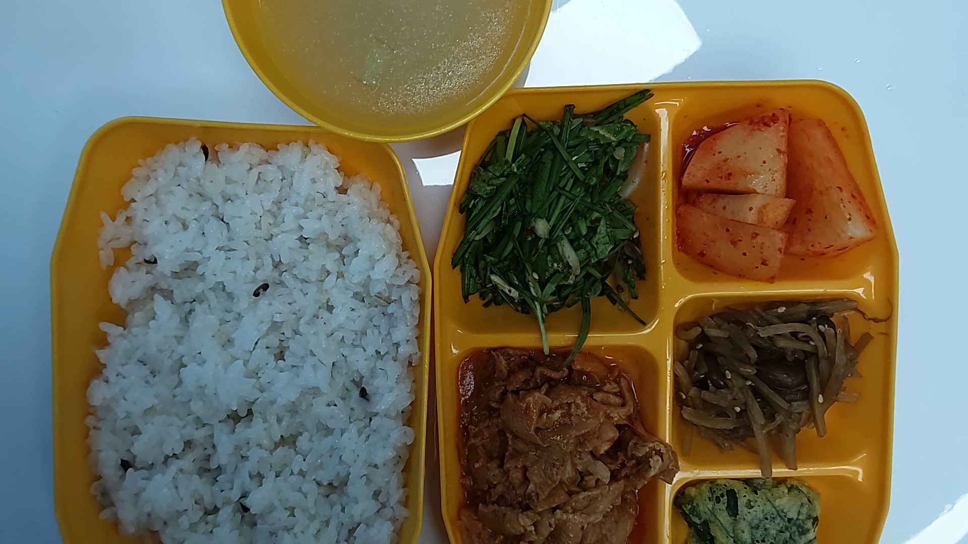 12월23일 잡곡밥, 들깨무채국, 신김치돈육볶음, 부추야채전, 우엉땅콩조림, 부추양파생채, 깍두기