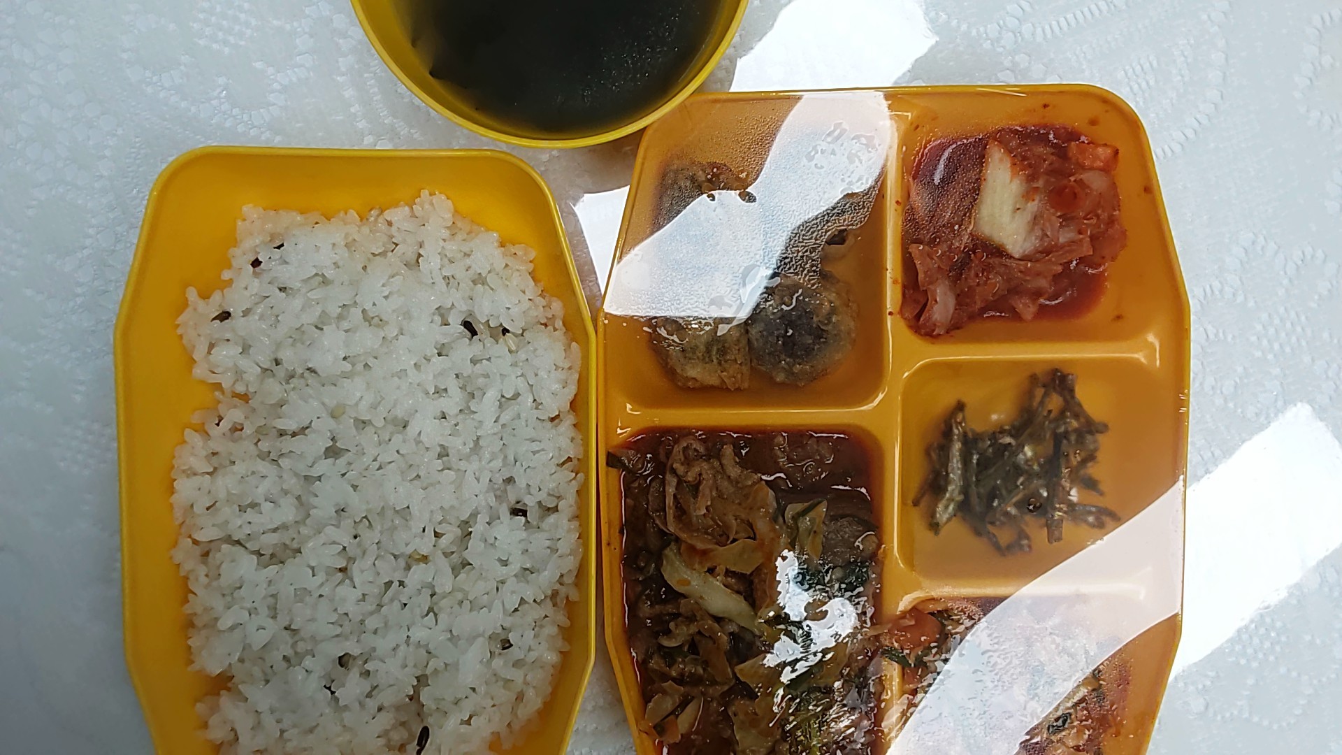 잡곡밥, 홍합미역국, 오리불고기, 순대튀김강정, 북어채해초무침, 고추장멸치초무침, 배추김치