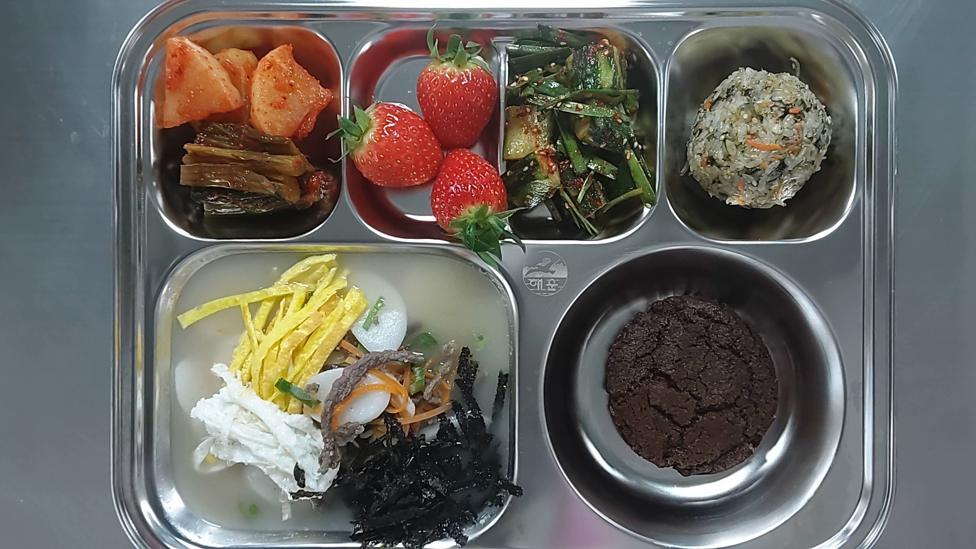 멸치주먹밥, 떡국(주), 깍둑오이무침, 우리밀초코쿠키, 석박지, 새콤딸기, *갓김치