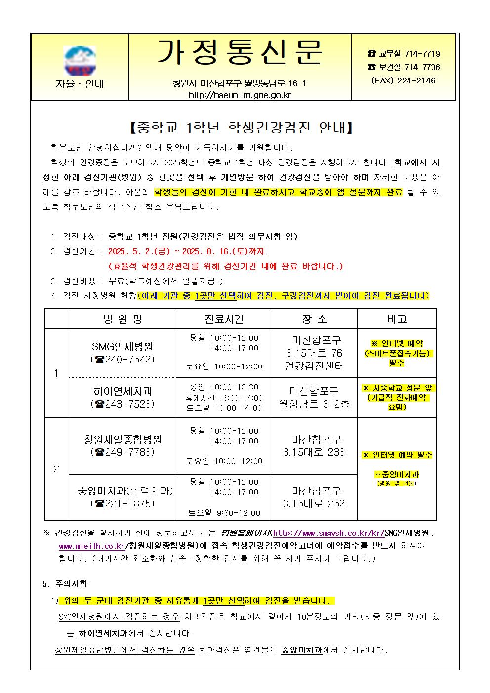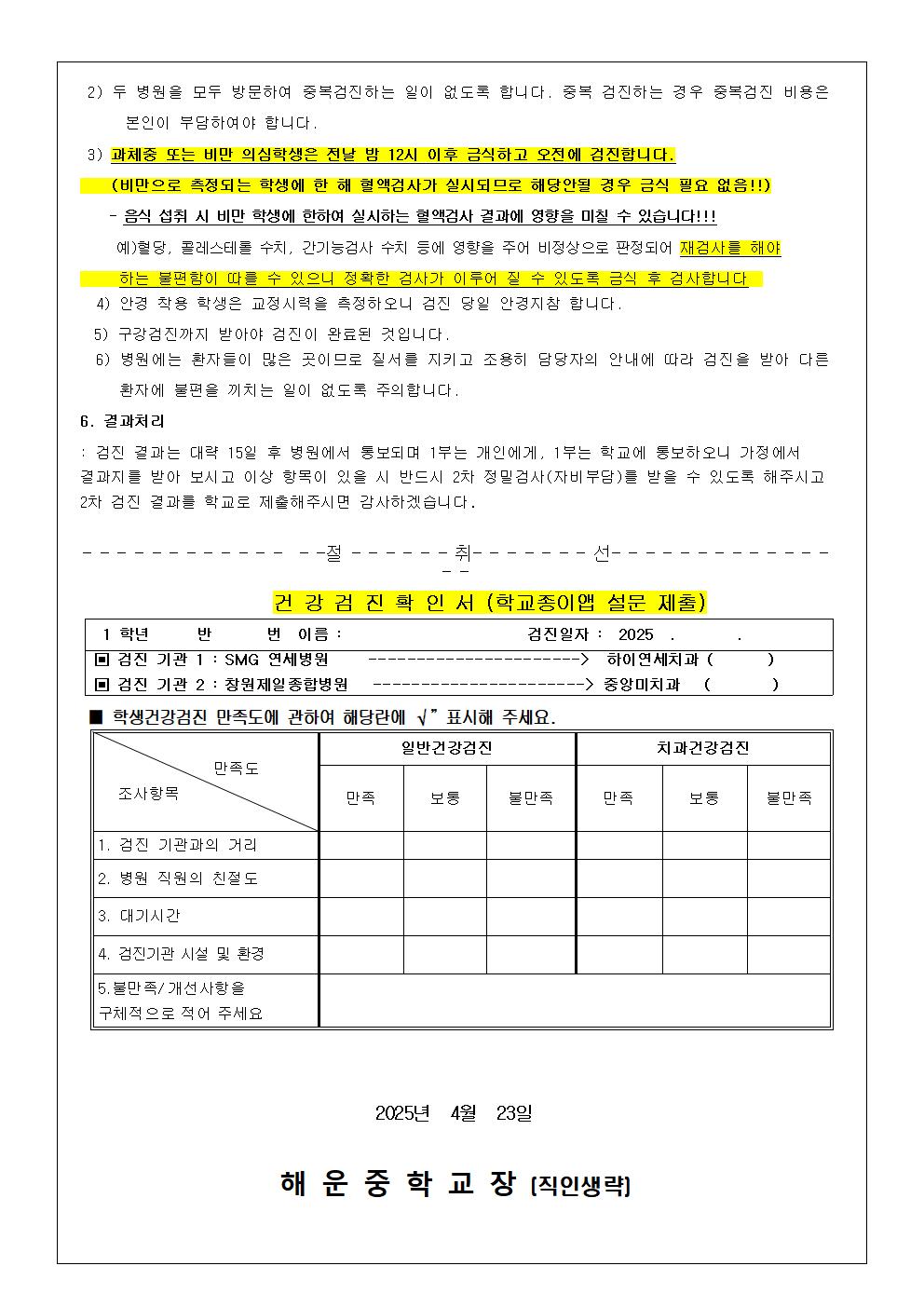 2025. 1학년 학생건강검진 안내