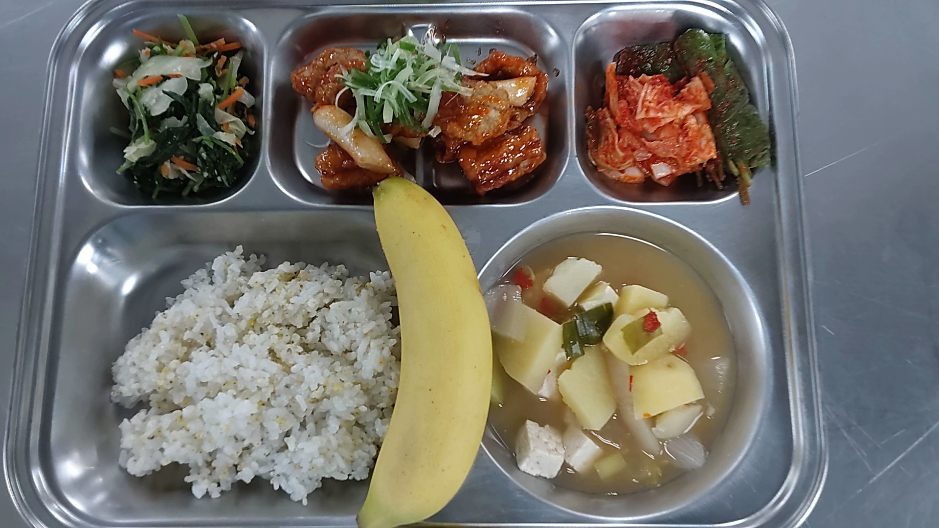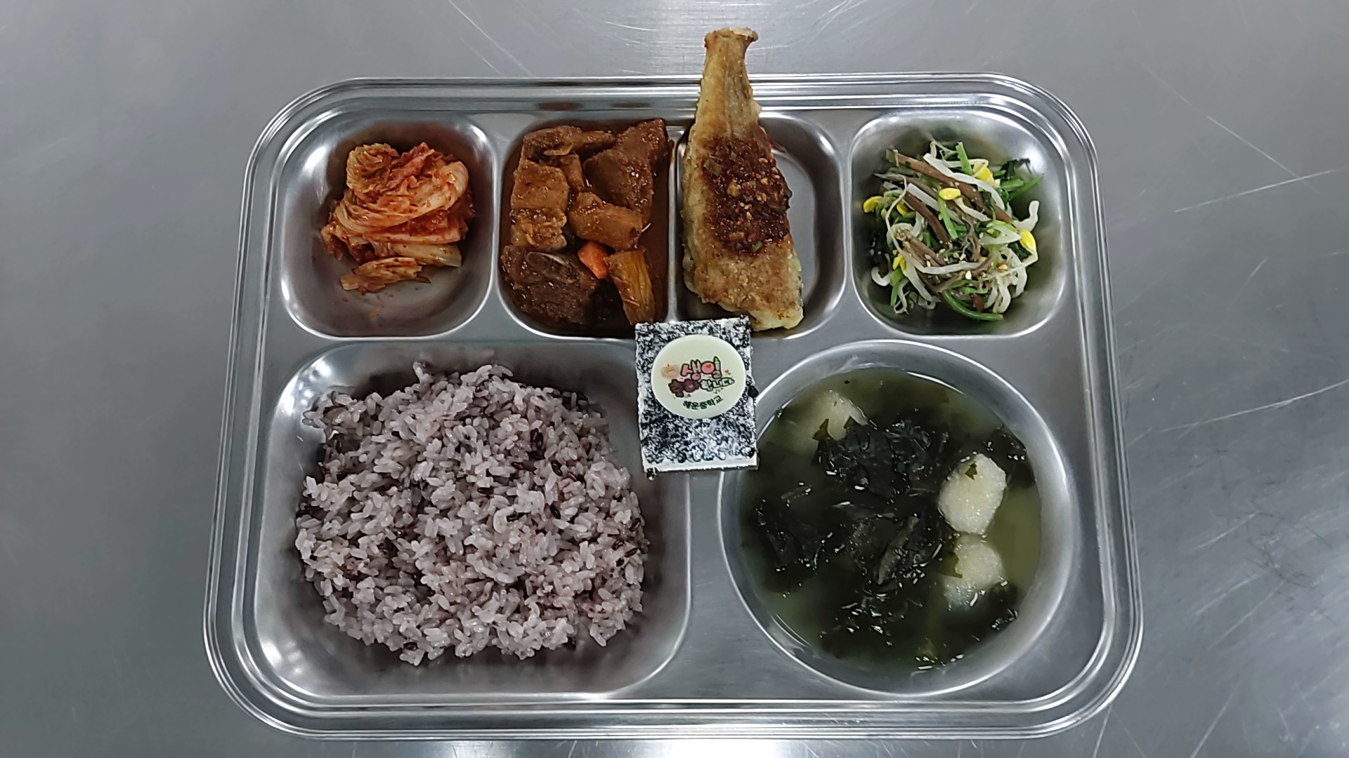 검정쌀밥/배추김치(9) 감자옹심이미역국(5.6.8.9.17.18) 매운돼지갈비찜(5.6.10.13) 삼색나물무침(콩고참)(5.6) 까망베르치즈케익(1.2.5.6) *조기구이&양념장(5.6) * 에너지/단백질/칼슘/철 853.3/43.9/248.8/3.7 | 기장밥 애호박된장국(5.6) 양배추참나물무침 장어떡강정&파채(1.2.5.6.12.13) 배추김치(9)/바나나 *생깻잎양념(5.6.13) * 에너지/단백질/칼슘/철 841.5/32.4/204.2/16. |