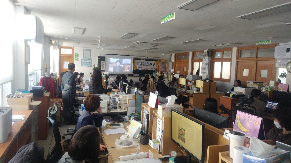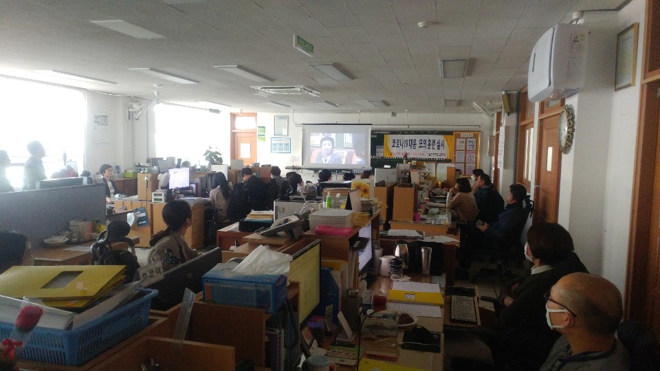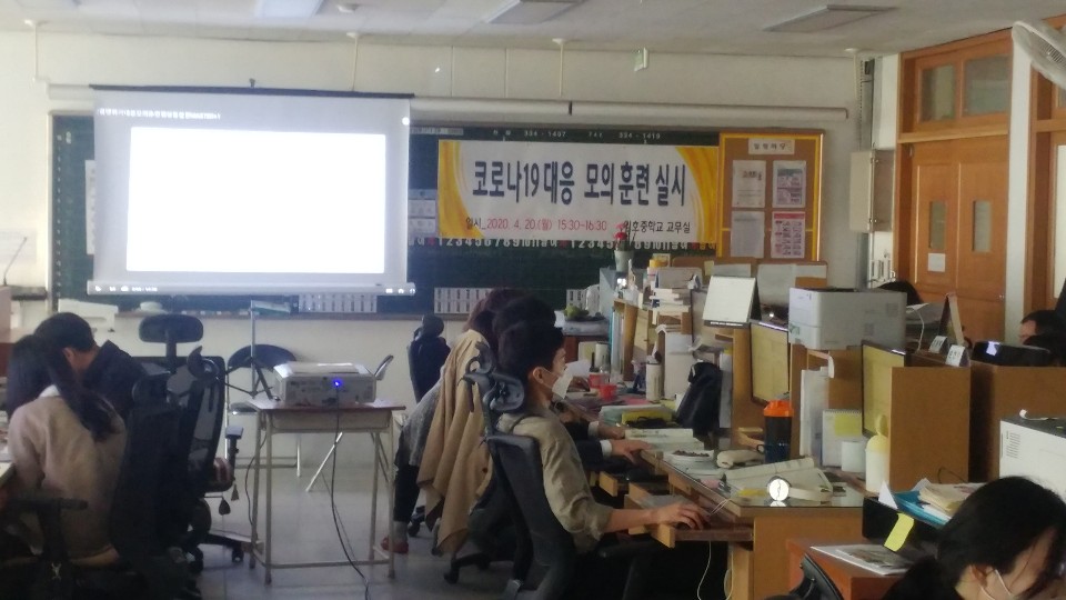 우리 학교는 코로나-19 대응 모의훈련을 4월 20일에 실시한 결과, 평상시 대응, 가정 내 의심환자 발생시 대응, 학교에서 의심 환자 발생시 대응 매뉴얼을 전 교직원이 숙지하고 있으며, 또한 마스크, 소독 용품, 손세정제, 교실 책상 1줄씩 배열 등 긴급 상황에 대처할 수 있도록 준비를 마쳤습니다.