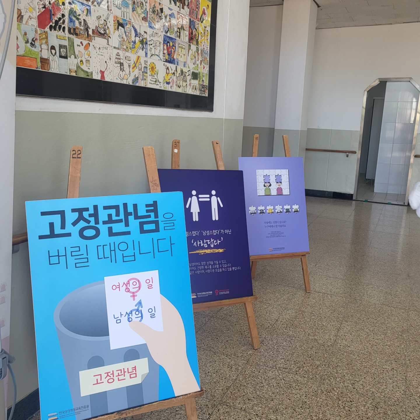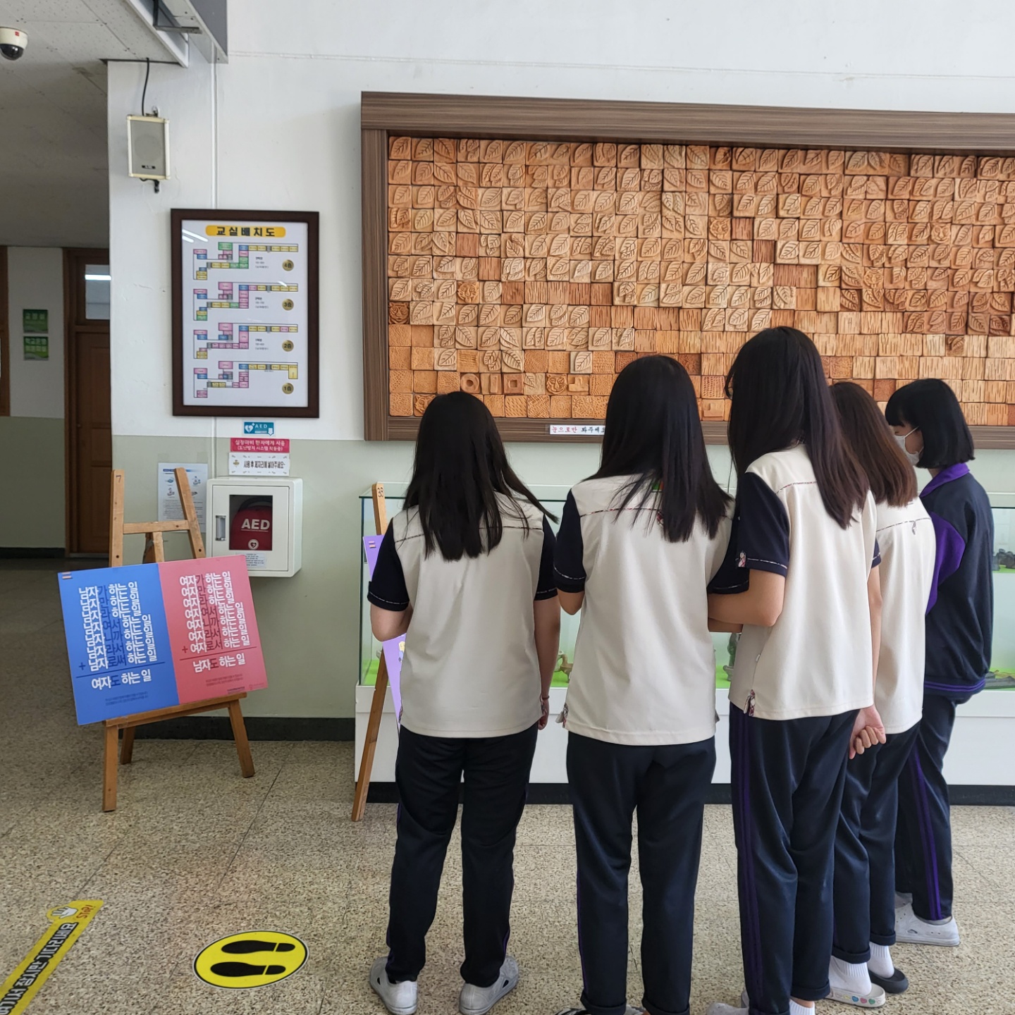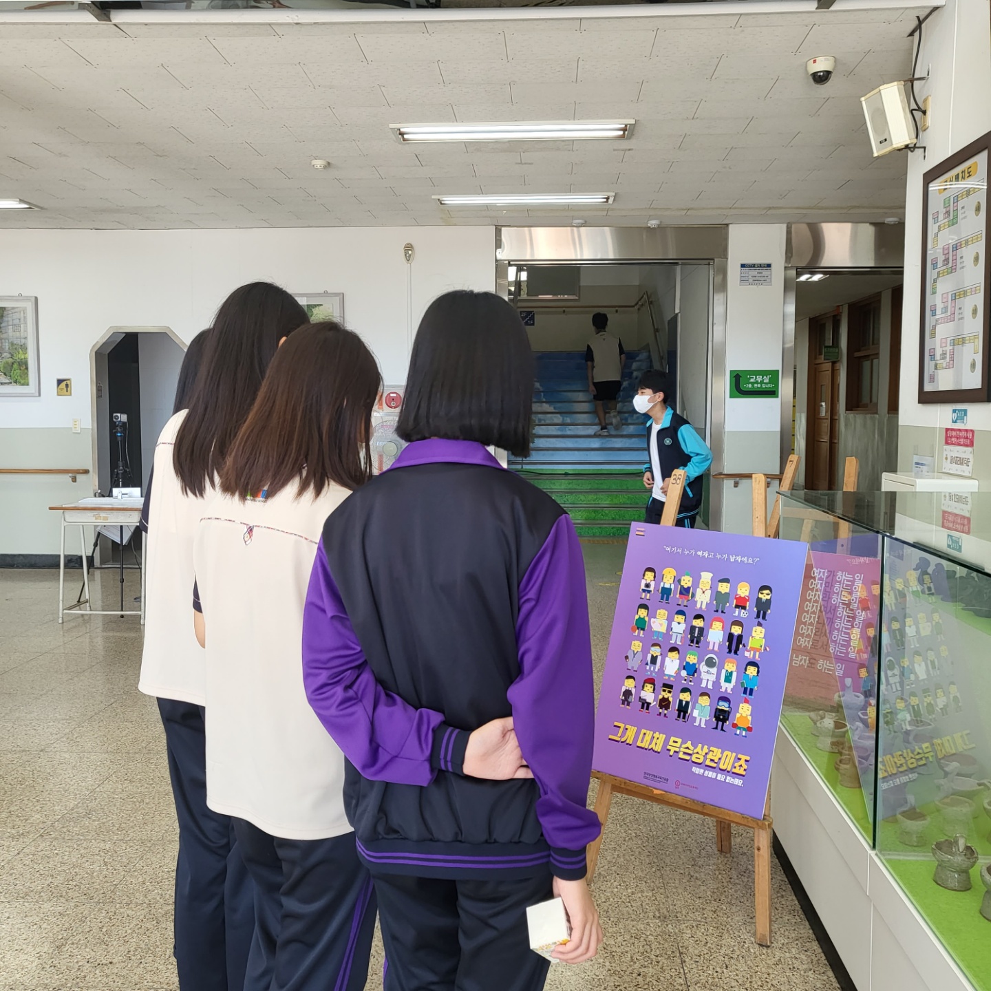 양성평등주간 보드전시물을 관람하고 있는 학생들의 모습입니다.