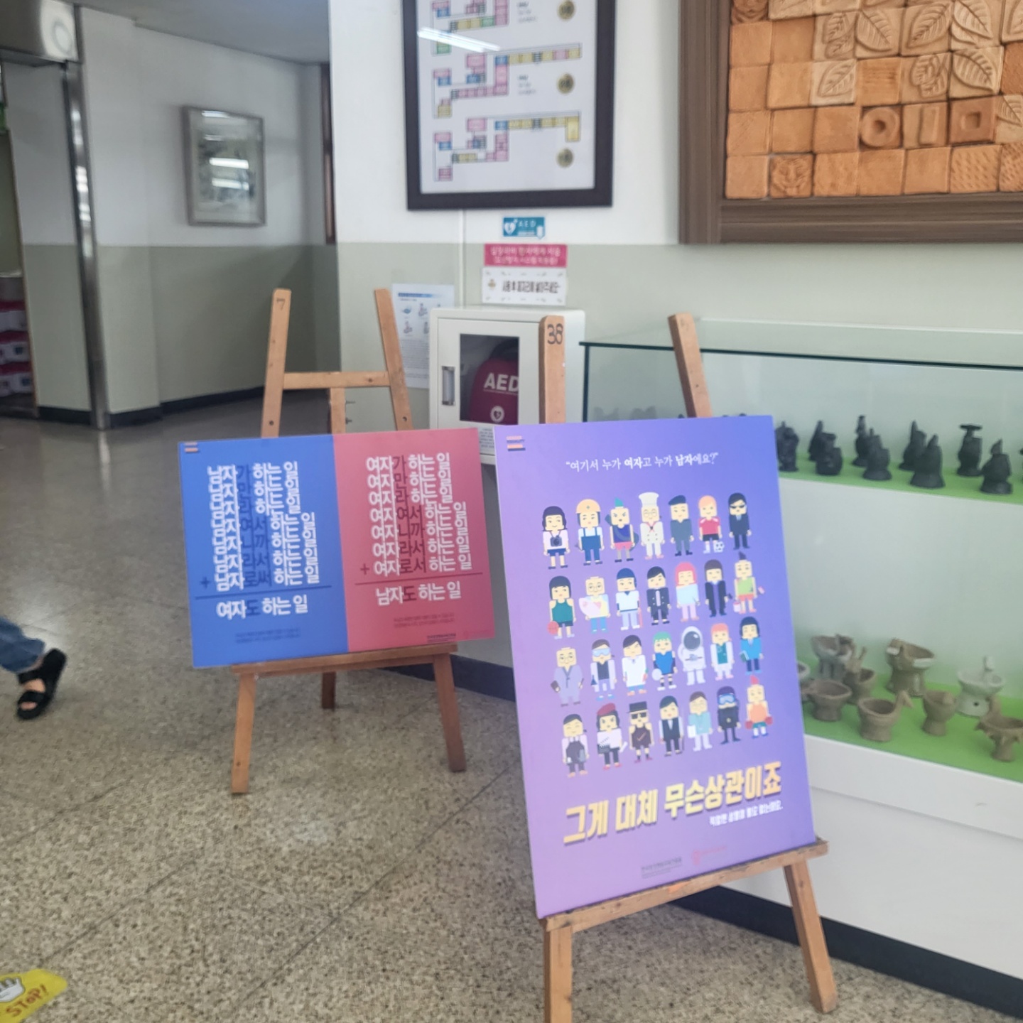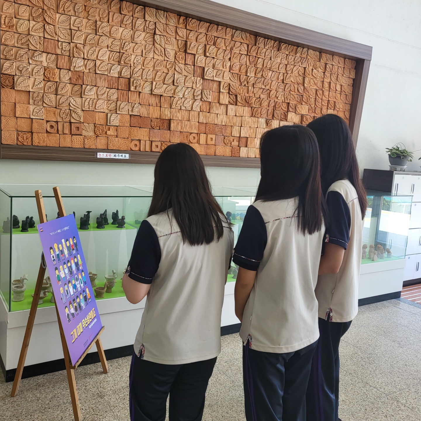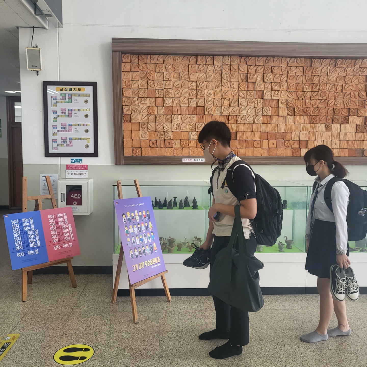 양성평등주간 보드전시물을 관람하고 있는 학생들의 모습입니다.