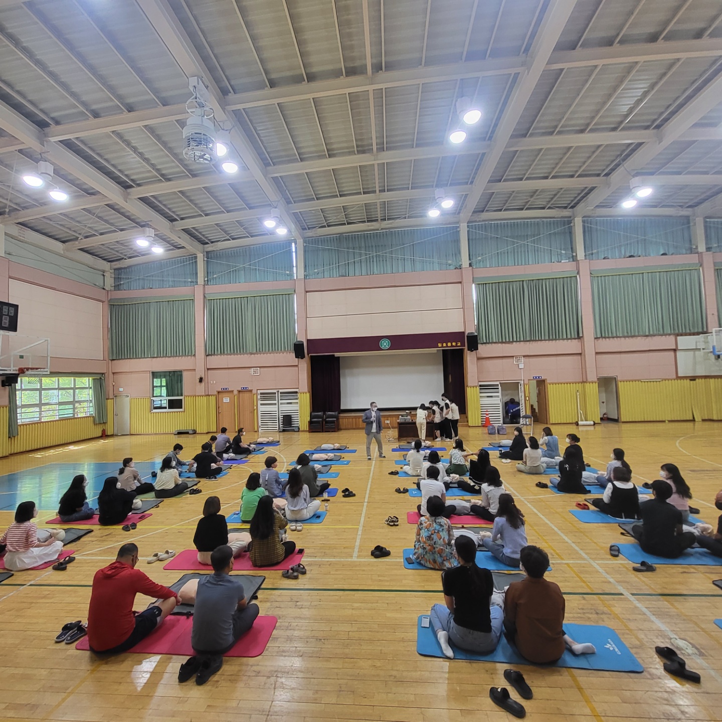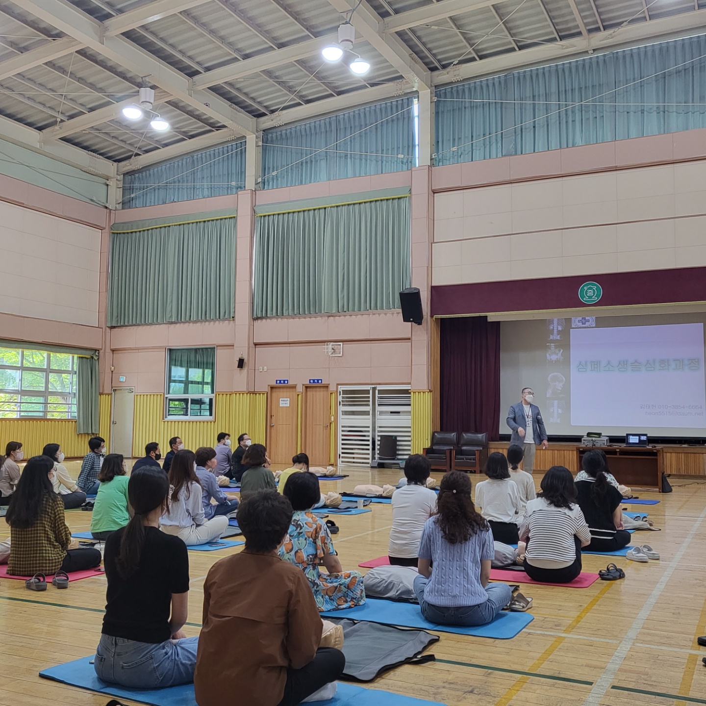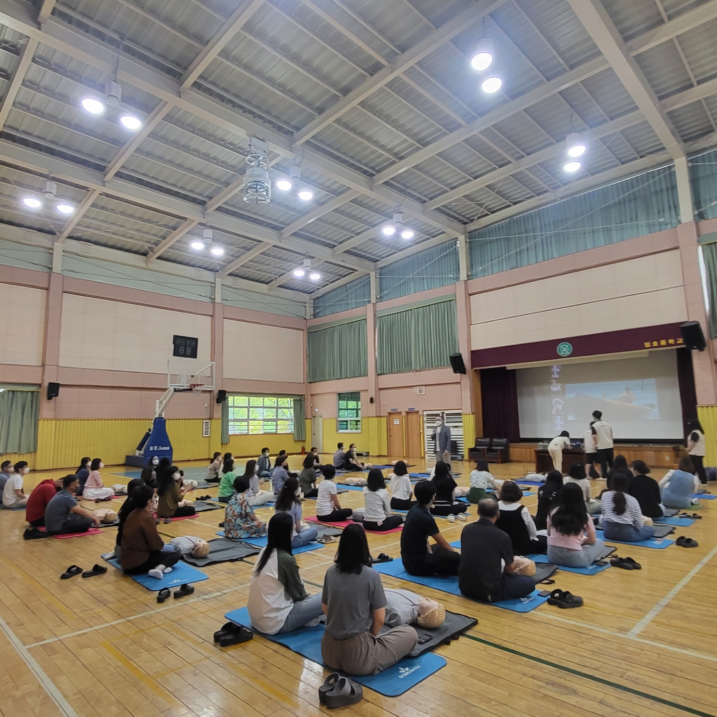 2022.9.20.(화) 13:30 ~ 16:30 (3시간) 에 체육관에서 전 교직원을 대상으로 심폐소생술 교육을 실시했습니다.