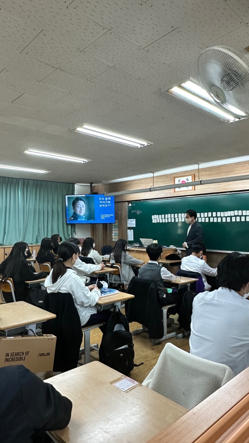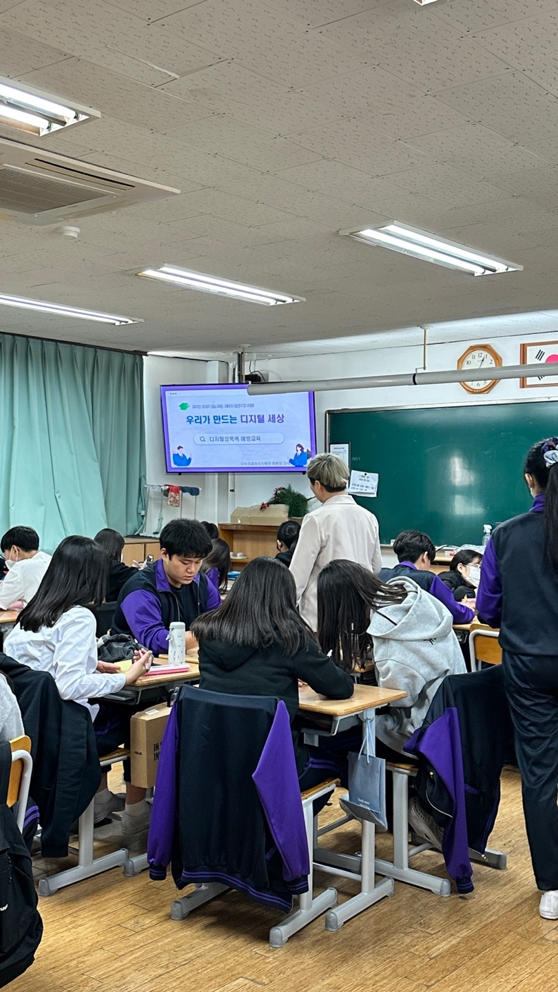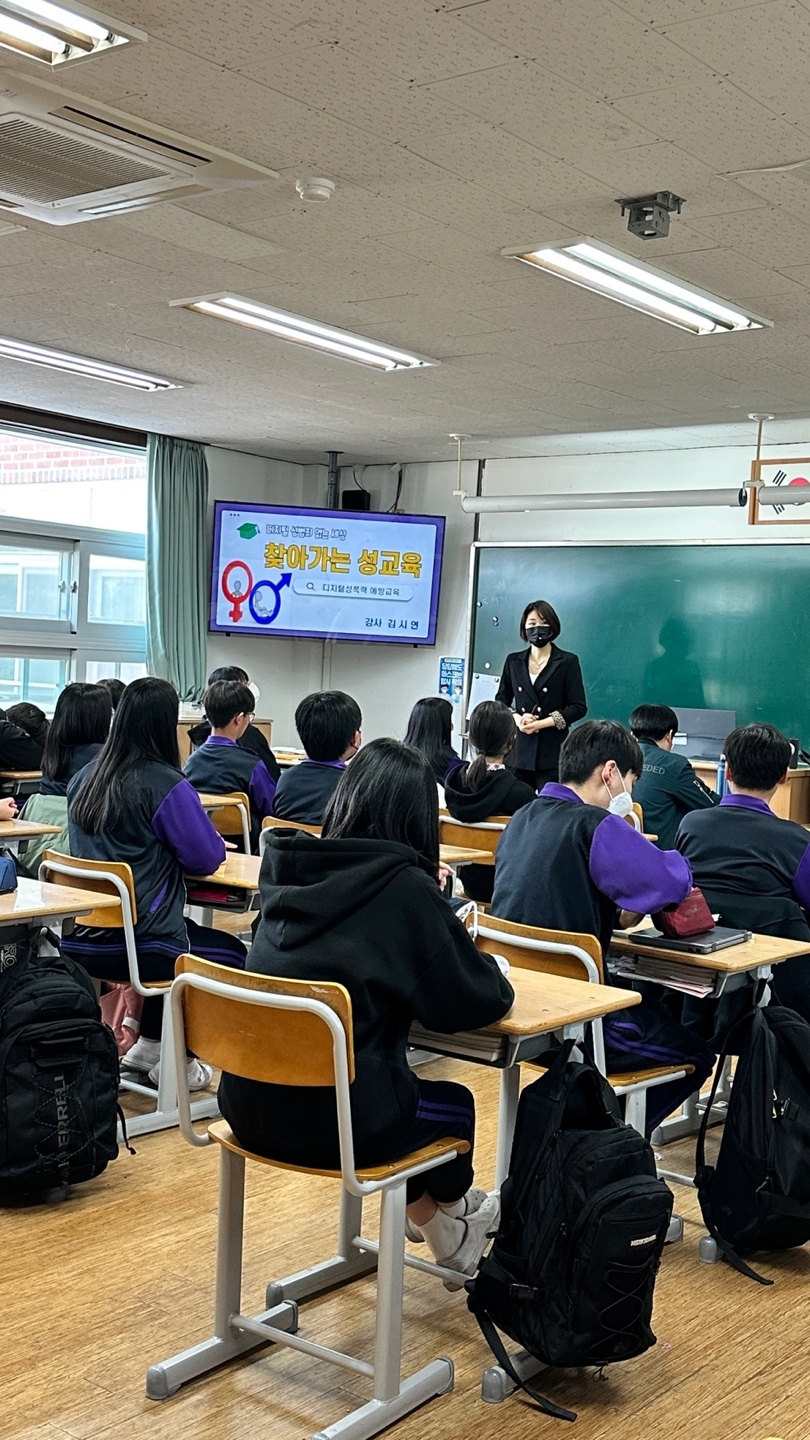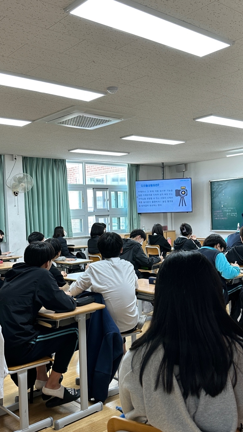 2023.3.28.(화) 7교시에 학생들을 대상으로 성폭력예방교육(디지털 성폭력, 친족에 의한 성폭력, 약물을 이용한 성폭력 포함)을 실시하였습니다. 다누리인재교육컨설팅의 전문강사님께서 성폭력의 정의와 실태, 대처방안을 자세하게 알려주는 유익한 시간이었습니다.