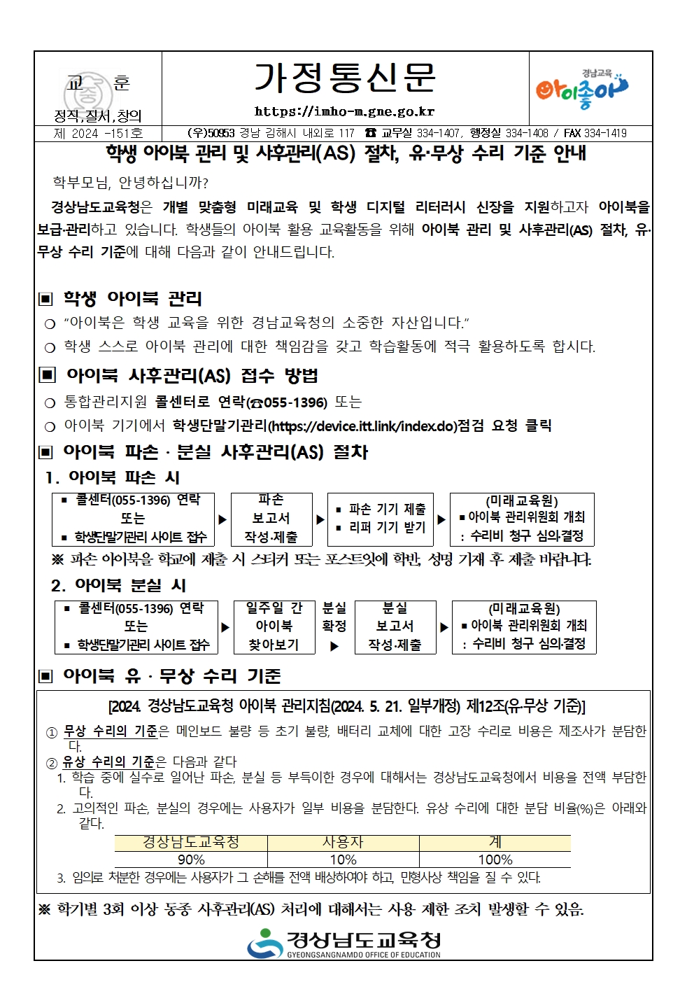 2024학년도 학생 아이북 관리 및 사후관리 절차, 유무상 수리 안내 가정통신문