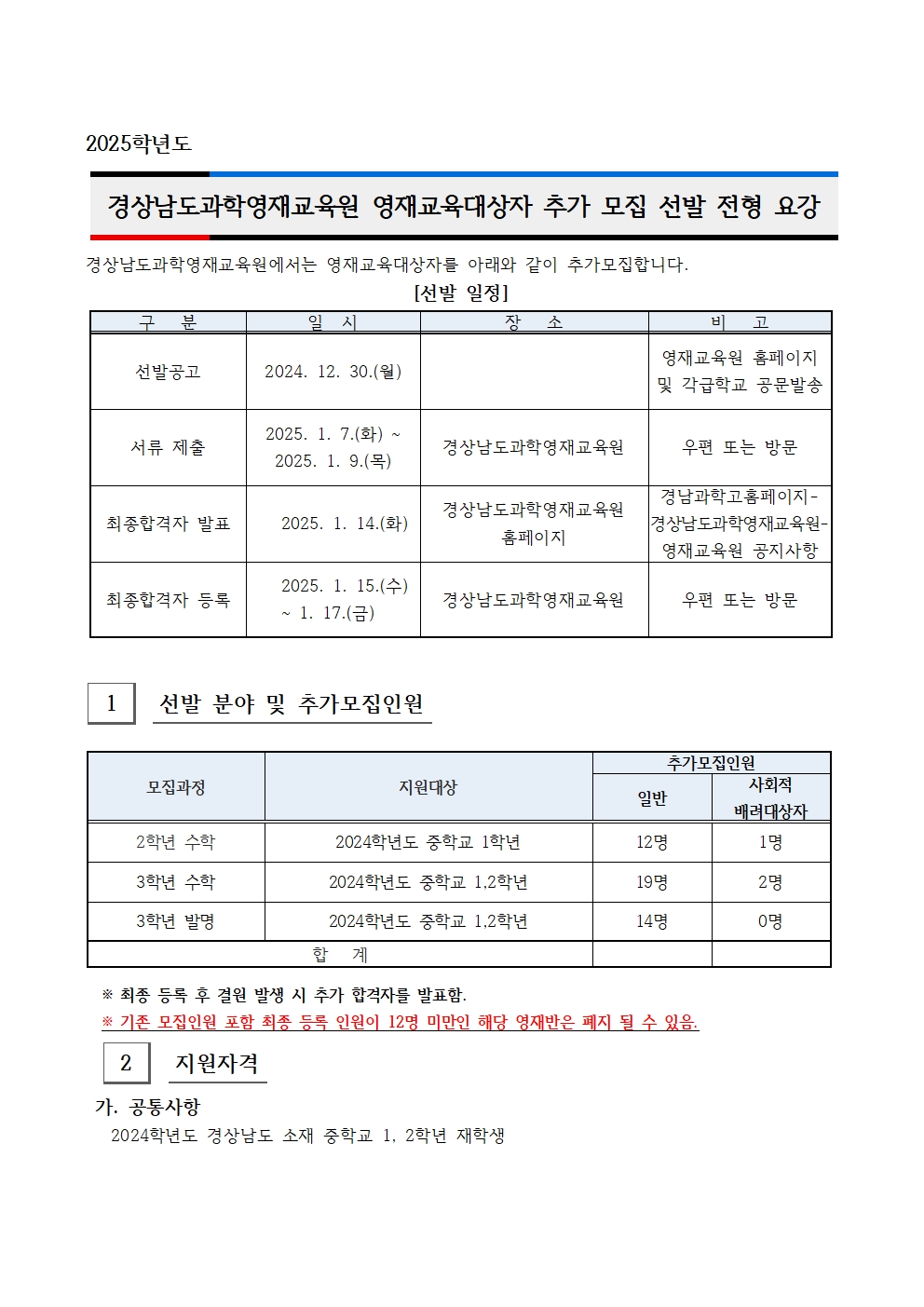 2025학년도 경남과학영재교육원 영재교육대상자 추가 모집 선발 전형 요강 안내