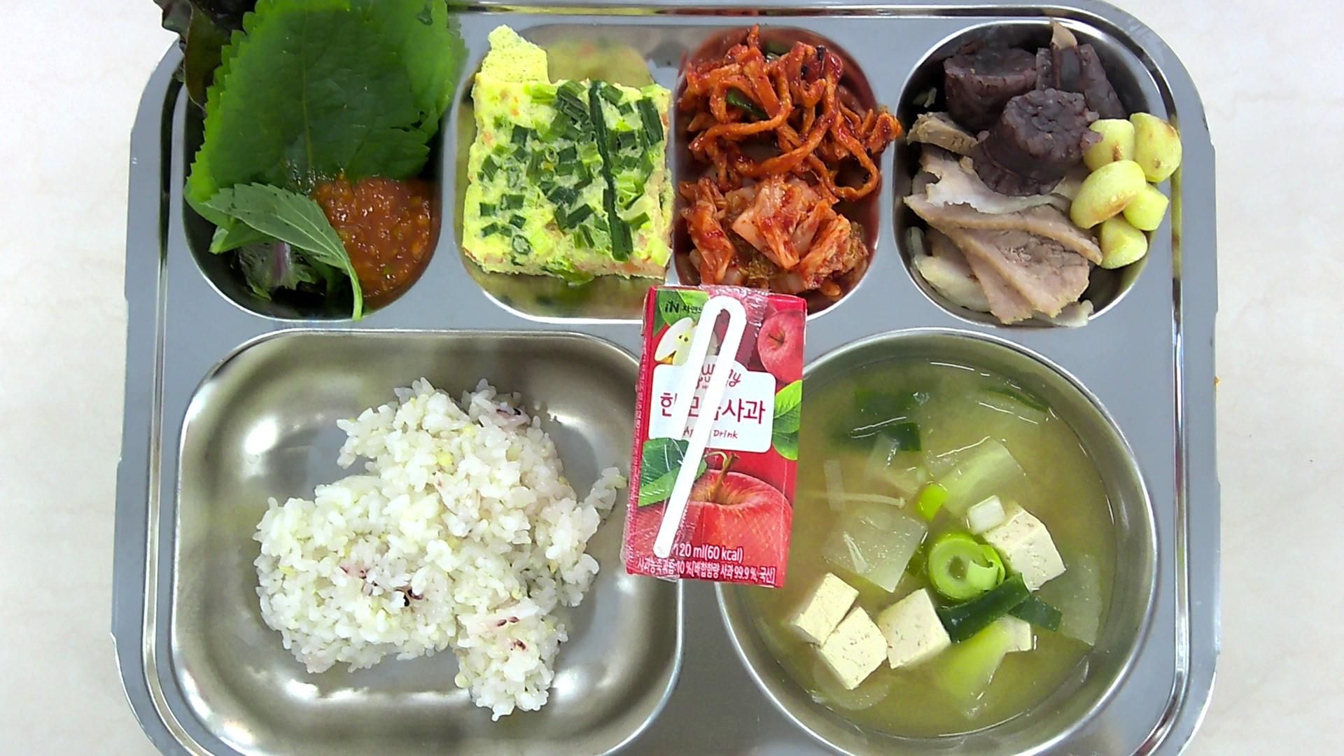 혼합잡곡밥* (5)두부된장국-중 (5.6.8.9.18)계란찜*중 (1.2.9)돼지고기수육*중 (5.6.10)상추/쌈장-중 (5.6.13)무말랭이무침(잔파) (5.6.13)순대(수육)*중 (2.5.6.10.13.16)배추김치* (9)사과주스*중 (13)