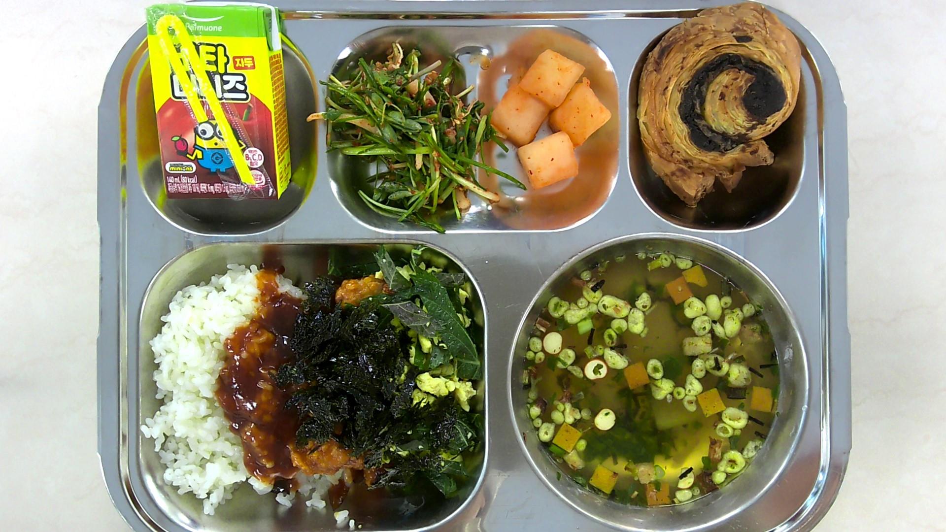 찹쌀밥*중 바베큐강정치밥(중) (1.2.5.6.13.15)가쓰오국(면x) (1.2.5.6.9)봄나물겉절이(두루3-중등),(자율) (5.6.13.18)깍두기* (9)주스5 (13)파이*2 (1.2.5.6)