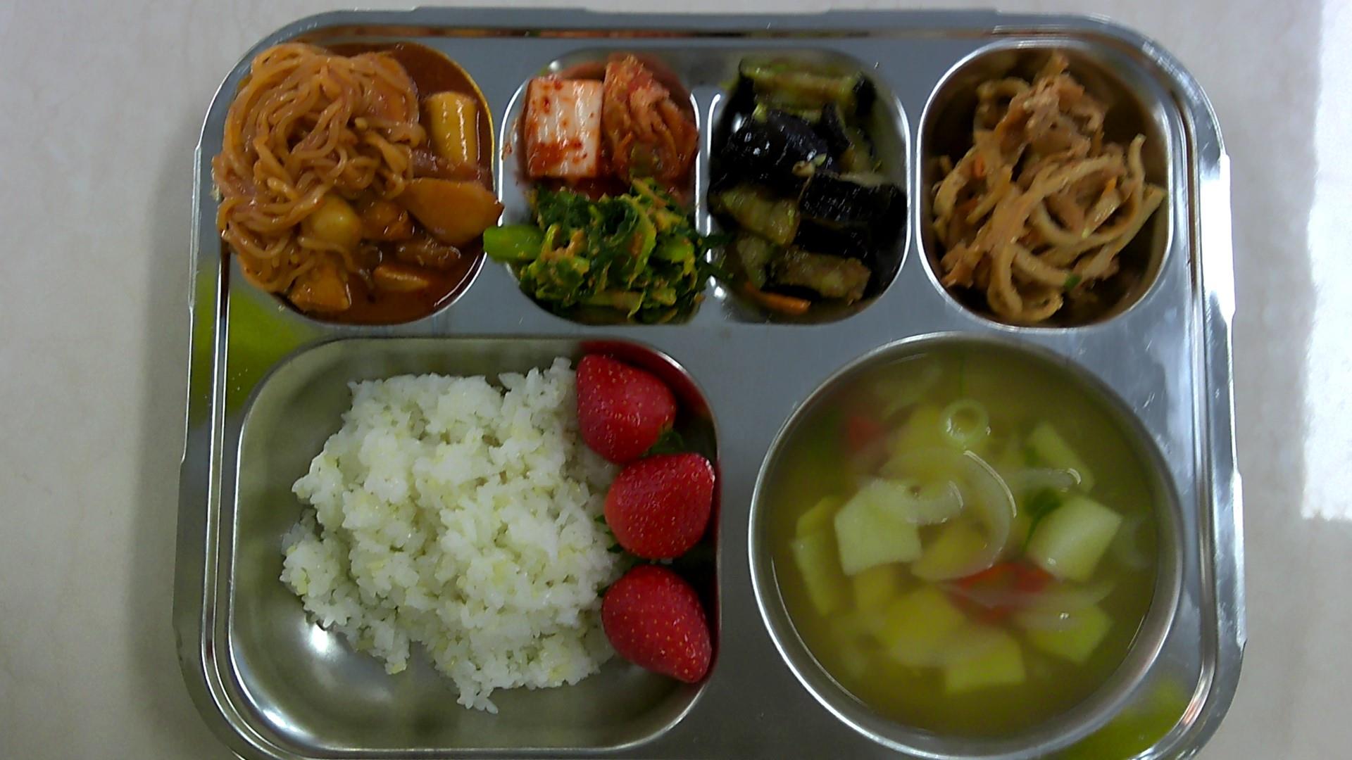현미밥* 감자맑은국* (8.9.18)봄동겉절이*(중) (5.6.13)허브가지구이무침(중)-자율 숯불닭볶음(중) (1.5.6.10.13.15)유부어묵채볶음(축하3-중등) (1.5.6.13)배추김치* (9)딸기(GAP)