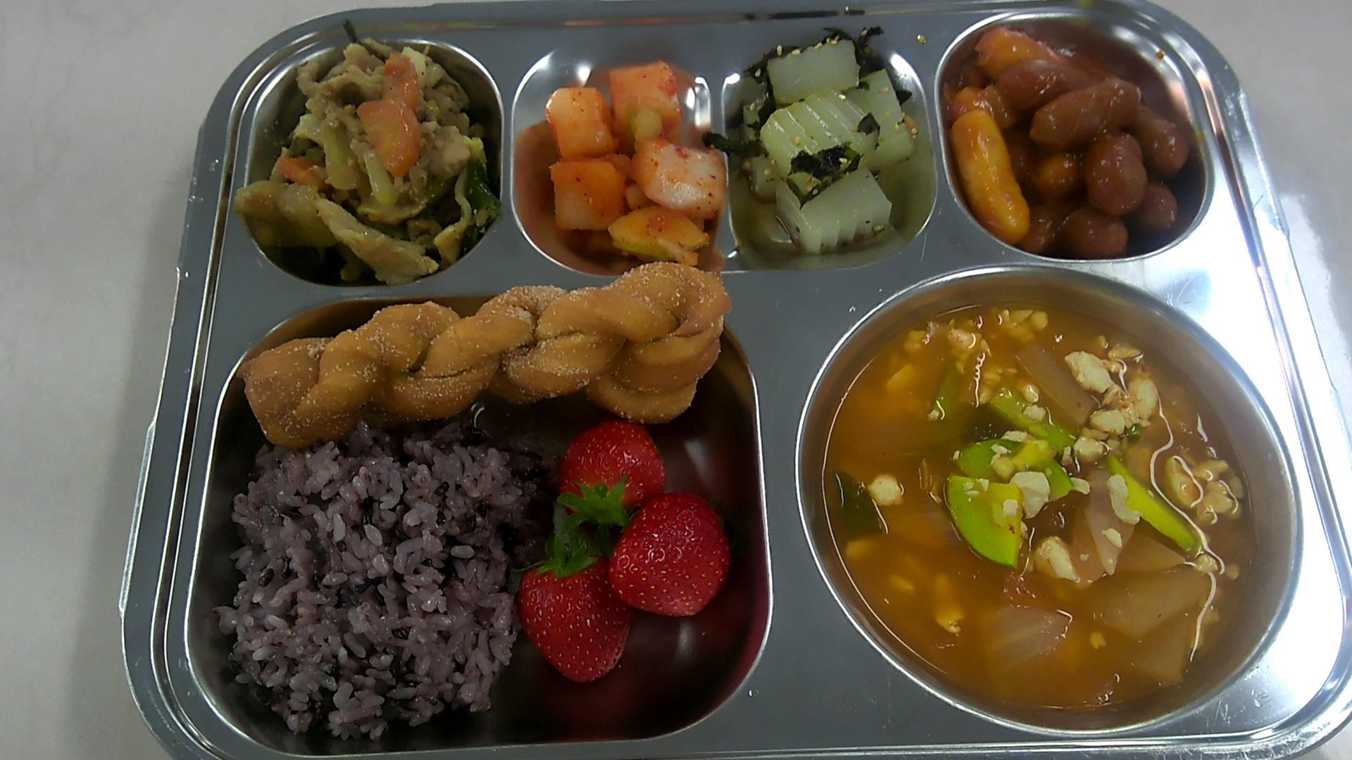검정쌀밥* 순두부찌개*중 (5.6.8.9.10.18)청포묵김*(중) (5.6.13)비엔나떡볶음 (2.5.6.10.13.15.16)바싹돼지불고기-중 (5.6.10.13)깍두기* (9)꽈배기(크럼블)-중 (1.2.5.6.13)딸기(GAP)