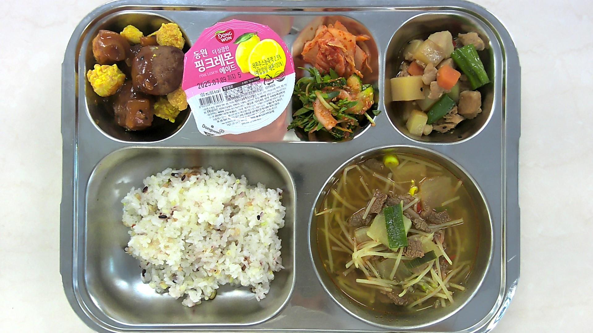 혼합잡곡밥* (5)쇠고기국*중 (5.6.16)돈육곤약장조림* (5.6.10.13)돌나물오이초무침*자 (13)한입두부미트볼땅콩강정*중 (1.2.4.5.6.10.12.13.15.16)배추김치* (9)핑크레몬에이드