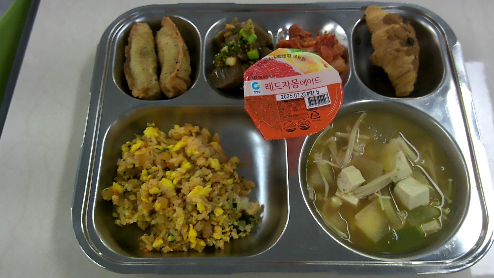 깍두기달걀볶음밥(다채롭5-중등) (1.5.6.9.13.18)팽이버섯된장국(다채롭5-중등) (5.6)도토리묵+양념장 (5.6.13)부추당면만두(채식)/초간장*중 (1.2.5.6.10.13.16.18)배추김치* (9)크루키(크로와상쿠키) (1.2.5.6)자몽에이드