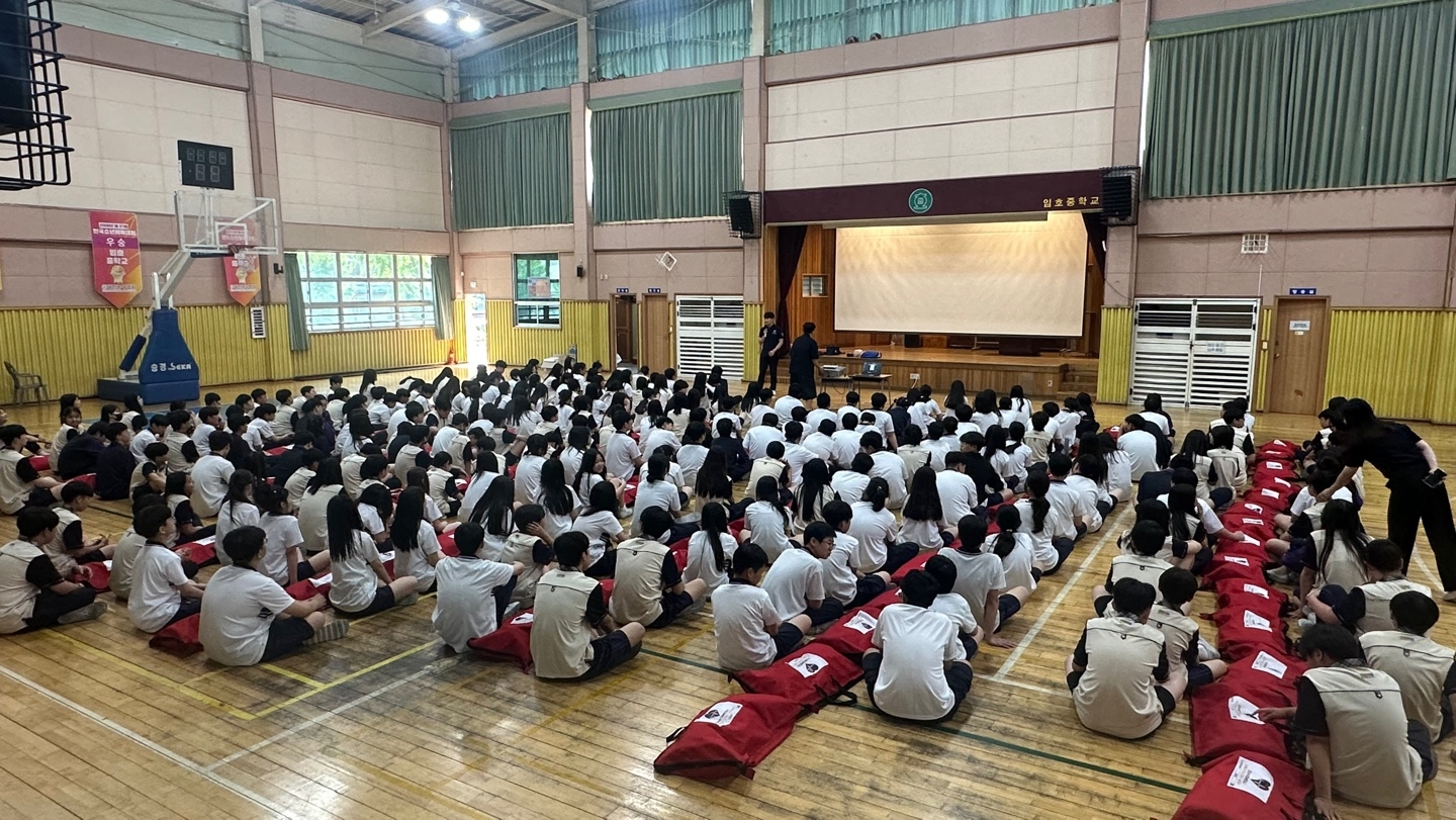 1학년은 체육관에서 대면교육(이론&실습)을, 2학년은 각반 교실에서 방송교육(이론)을 실시하였습니다