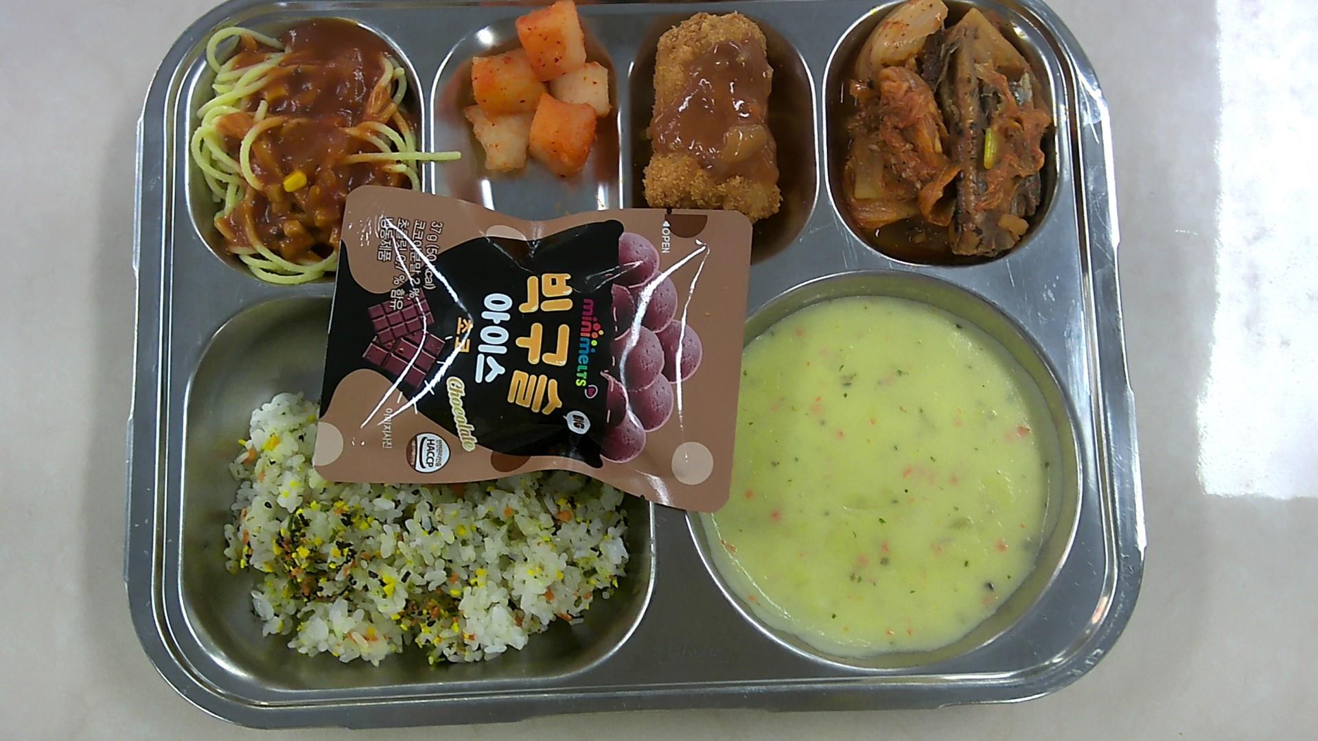 찹쌀밥*중 크림스프* (2.5.6.13.16)스파게티(적은양)-중 (1.2.5.6.10.12.13.15.16)꽁치김치조림(자율) (5.6.9)블럭치즈돈가츠 (1.2.5.6.10.12.13.18)깍두기* (9)빅초코볼아이스크림 (1.2.5)후리카케 (1.2.5.6.9.13.16.18)