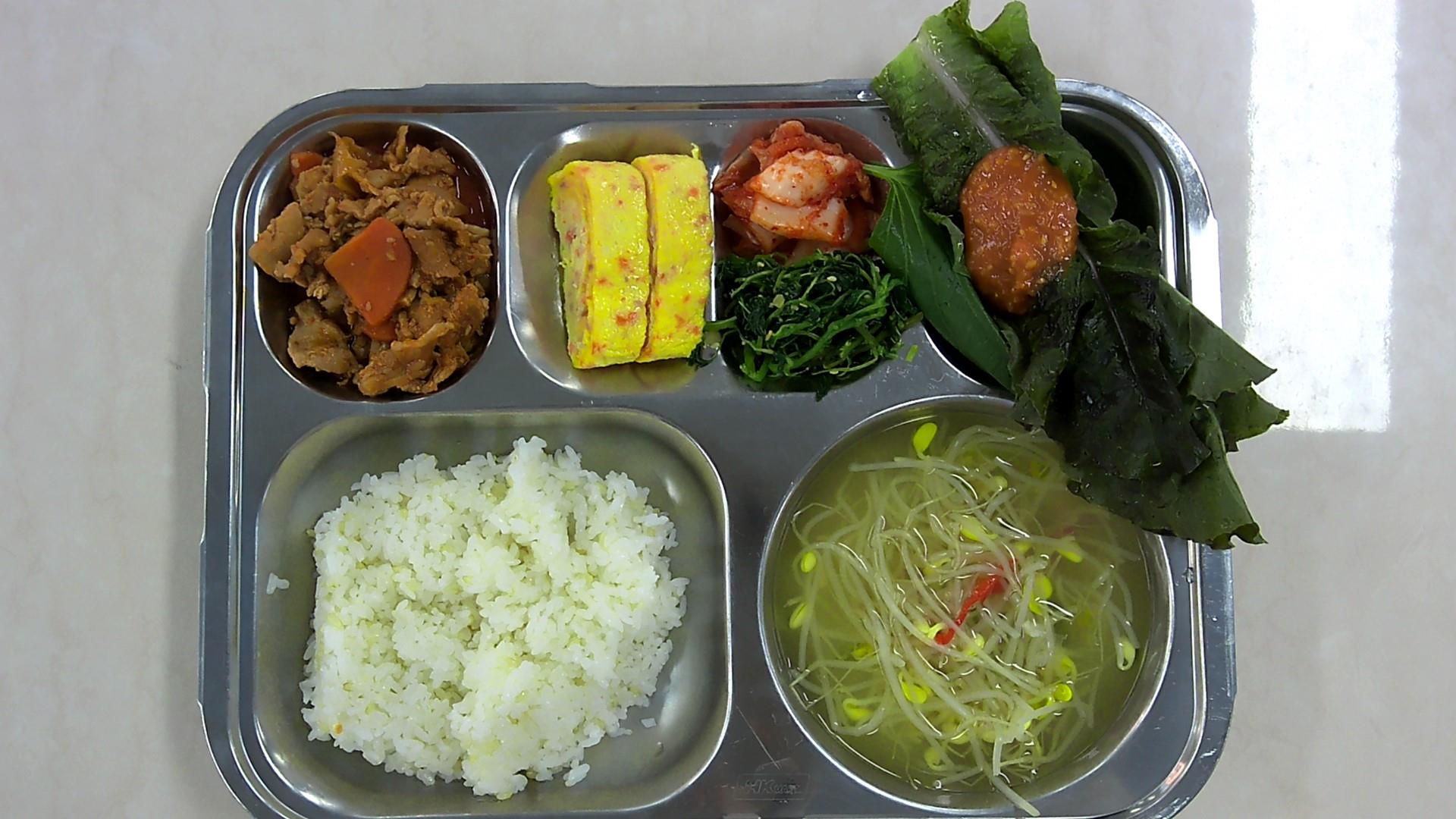 현미밥* 맑은콩나물국*중 (5)비름나물*자율(중) (5.6)상추/쌈장-중 (5.6.13)고추장불고기-중 (5.6.10.13)햄달걀말이* (1.2.5.6.10.15.16)배추김치* (9)