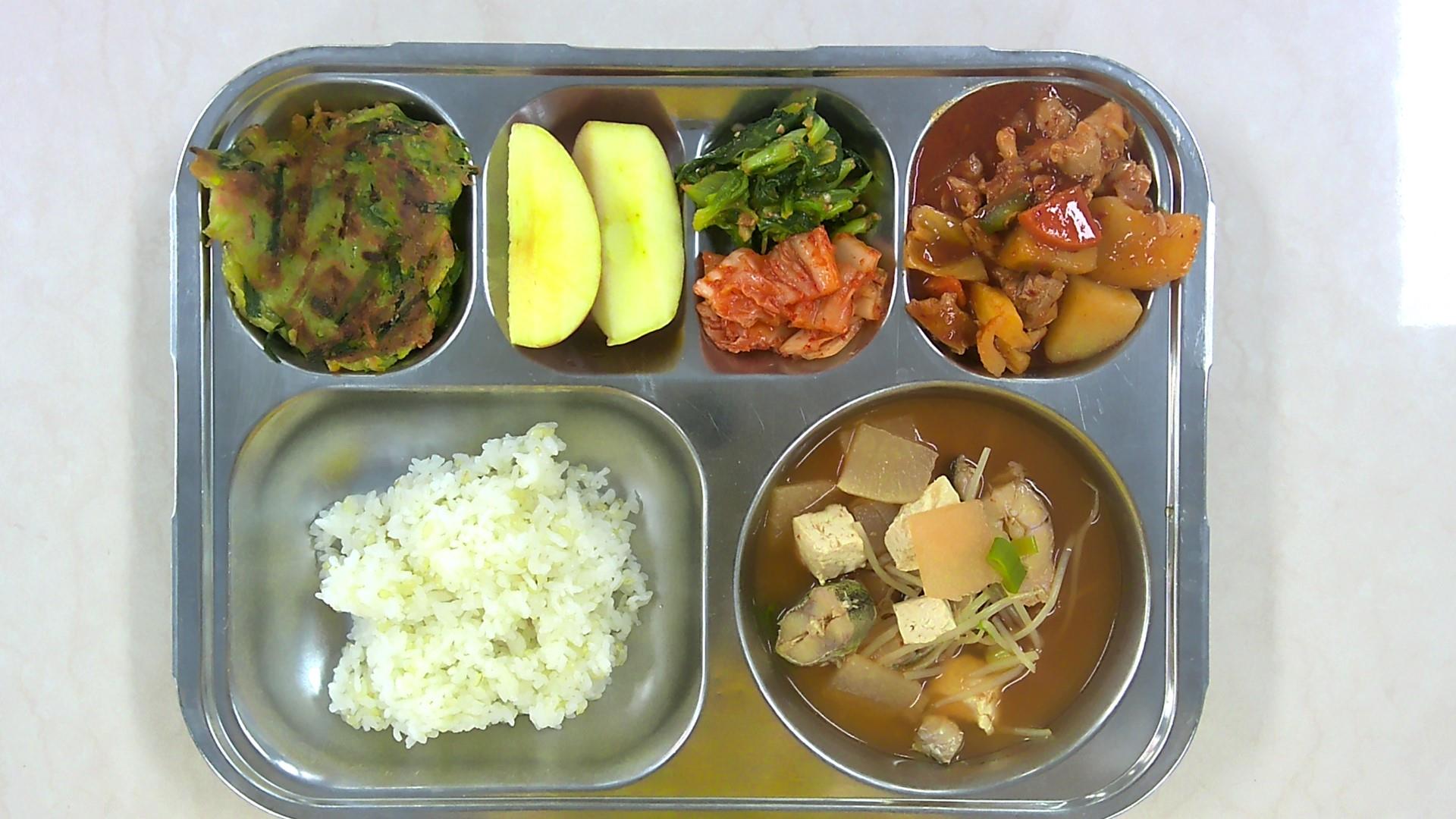 현미밥*동태국*중(5)단배추된장무침*(5.6.13)유가네식찜닭(중)(5.6.13.15)호박채소전*중(5.6.9)배추김치*(9)사과(부사)* 에너지/단백질/칼슘/철707.6/39.7/260.7/3.1