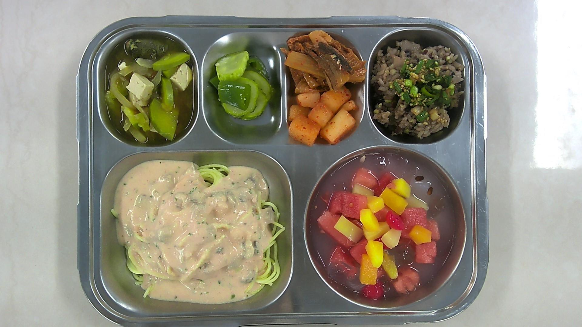 적은연잎영양밥&양념장(5.6.13)미더덕된장국(5.6.9)신김치찜(자율)(5.6.9)명란버섯크림파스타(1.2.5.6.9.13)깍두기*(9)수제고추오이피클(13)수박화채(2.11.13)* 에너지/단백질/칼슘/철635.6/22.1/286.4/3.1