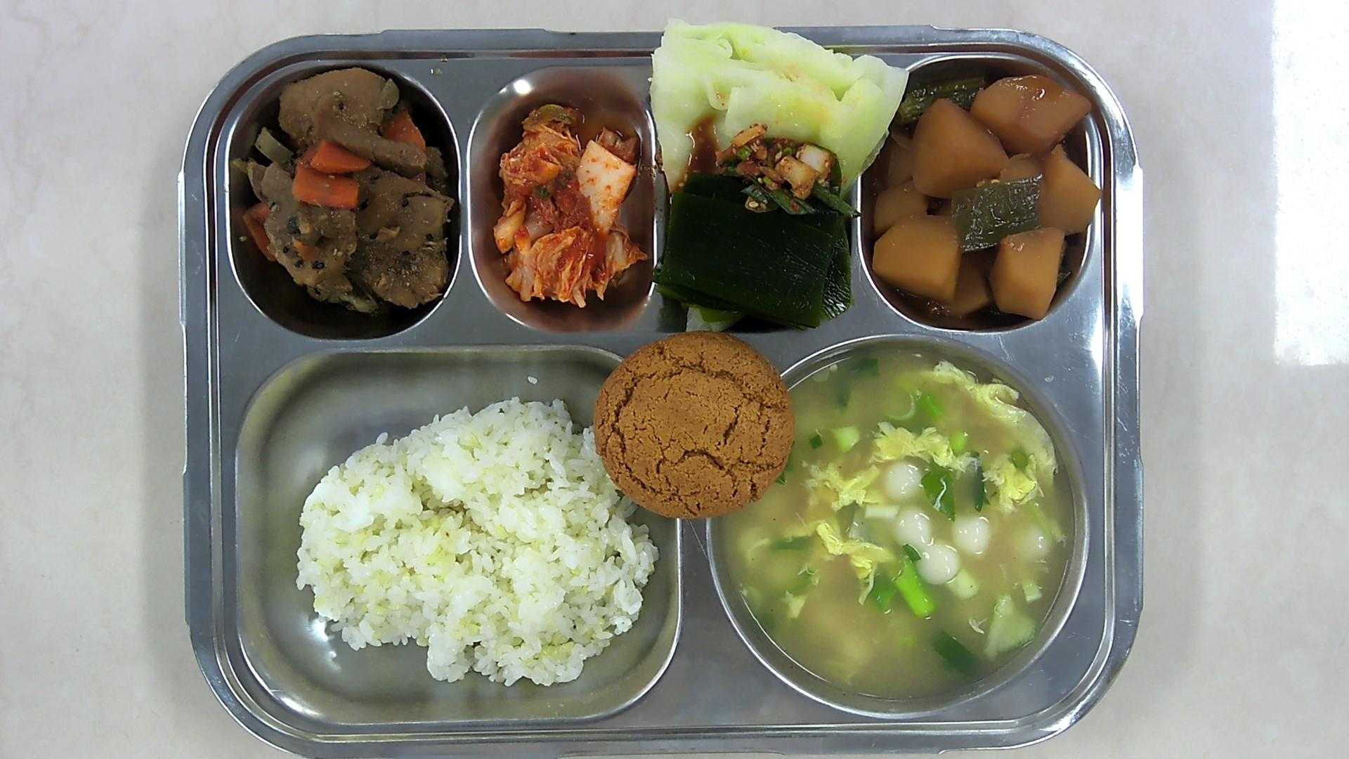 현미밥*조랭이떡국*(1.5.6)감자꽈리고추조림*(5.6.13)양배추다시마쌈(자율)(5.6)돼지갈비한입구이(5.6.10.13)배추김치*(9)버터쿠키(1.2.5.6)* 에너지/단백질/칼슘/철915.1/31.6/148.5/3.3
