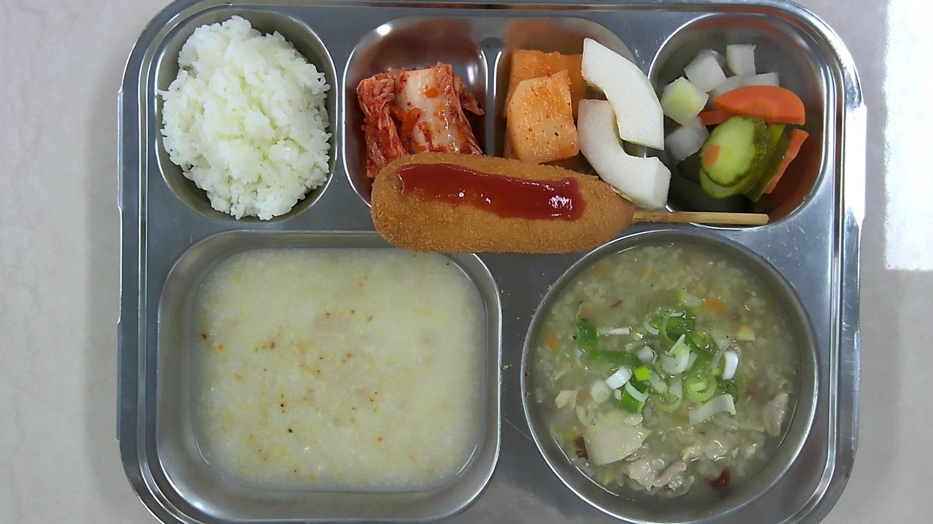 적은밥/중영양닭죽(15)누룽지탕*중오이피클배추김치*자율(9)석박지*(9)/참외모짜렐라 치즈핫도그/케첩*(1.2.5.6.10.12.13.16)* 에너지/단백질/칼슘/철646.0/26.7/155.1/1.6