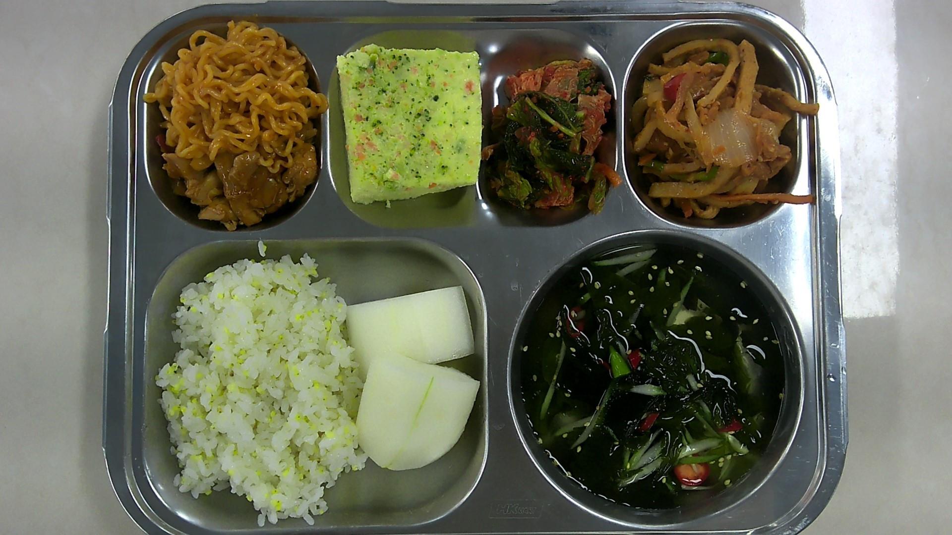 기장밥*중미역오이냉국*중(13)브로콜리계란찜*중(1.2.9)숯불닭볶음(중)(1.5.6.10.12.13.15)유부어묵채볶음(1.5.6.13)배추김치*(9)참외* 에너지/단백질/칼슘/철774.2/38.1/205.0/3.3