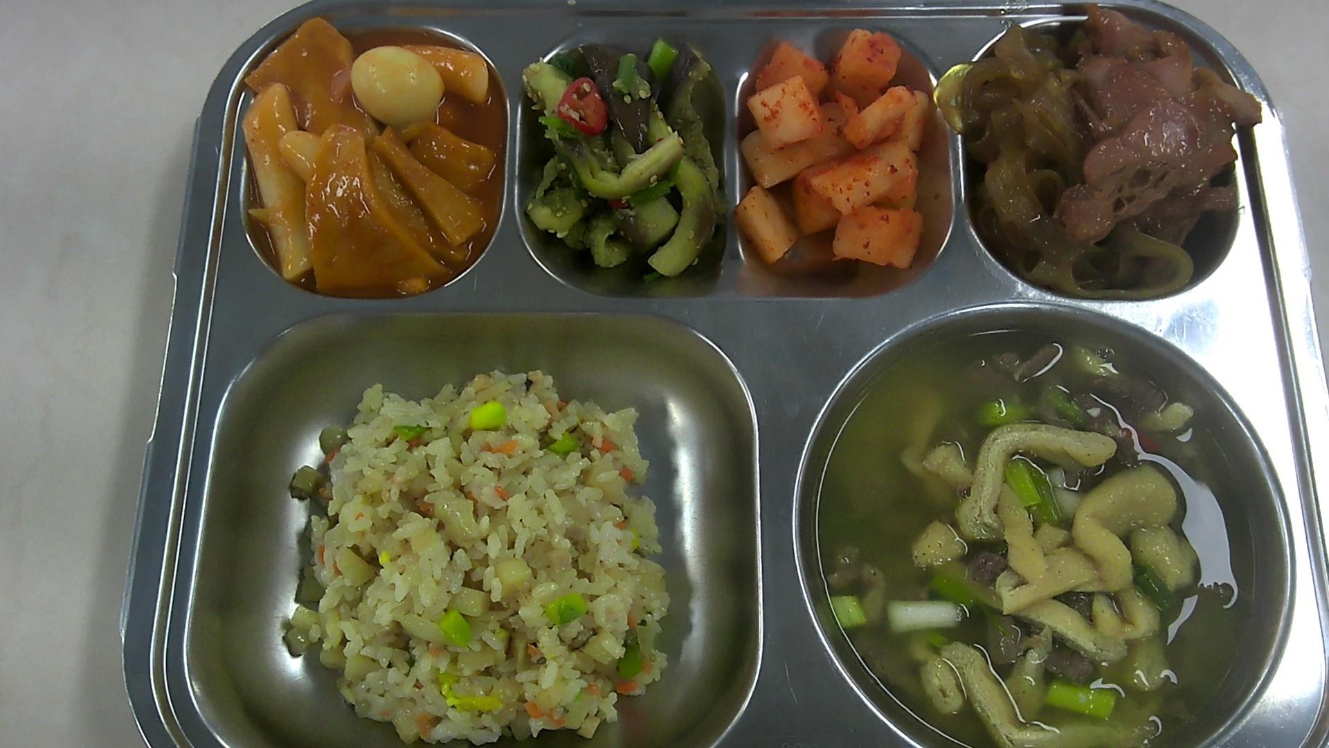 굴소스볶음밥-고명,중(1.2.5.6.10.13.15.16.18)가쓰오장국(5.6.16)순살족발(5.6.10.12.13.15.16.18)가지나물*(자율)(5.6)떡볶이(1.5.6.13)깍두기*(9)* 에너지/단백질/칼슘/철770.7/37.3/250.6/3.5