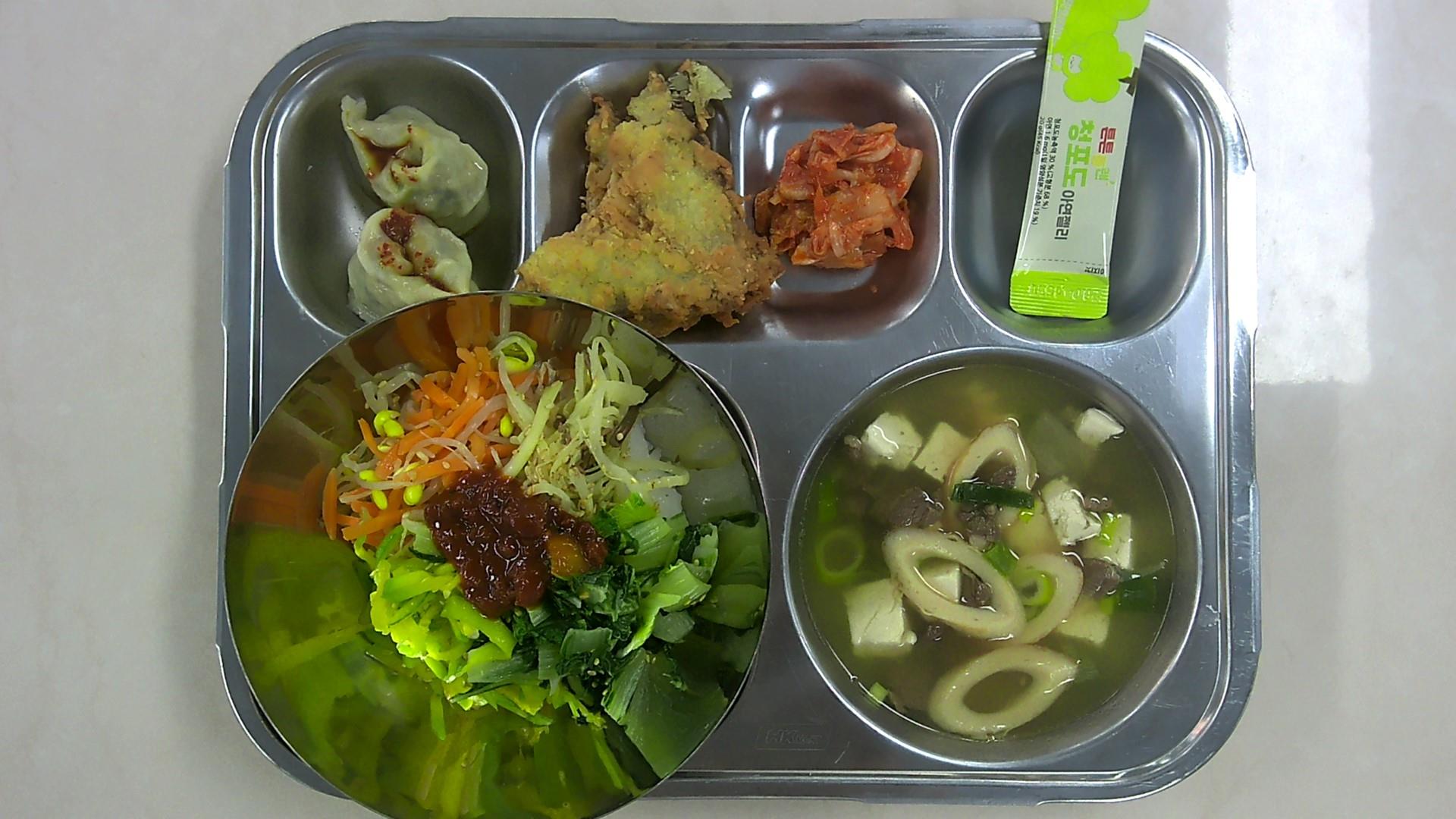 나물비빔밥/약고추장(5.6.13.16)한우탕국(1.5.6.13.16)포자찐만두☆(1.5.6.10.13.16.18)조기순살구이(자율)(6)배추김치(9)짜먹는젤리(포도맛)☆* 에너지/단백질/칼슘/철630.9/24.4/189.8/4.7