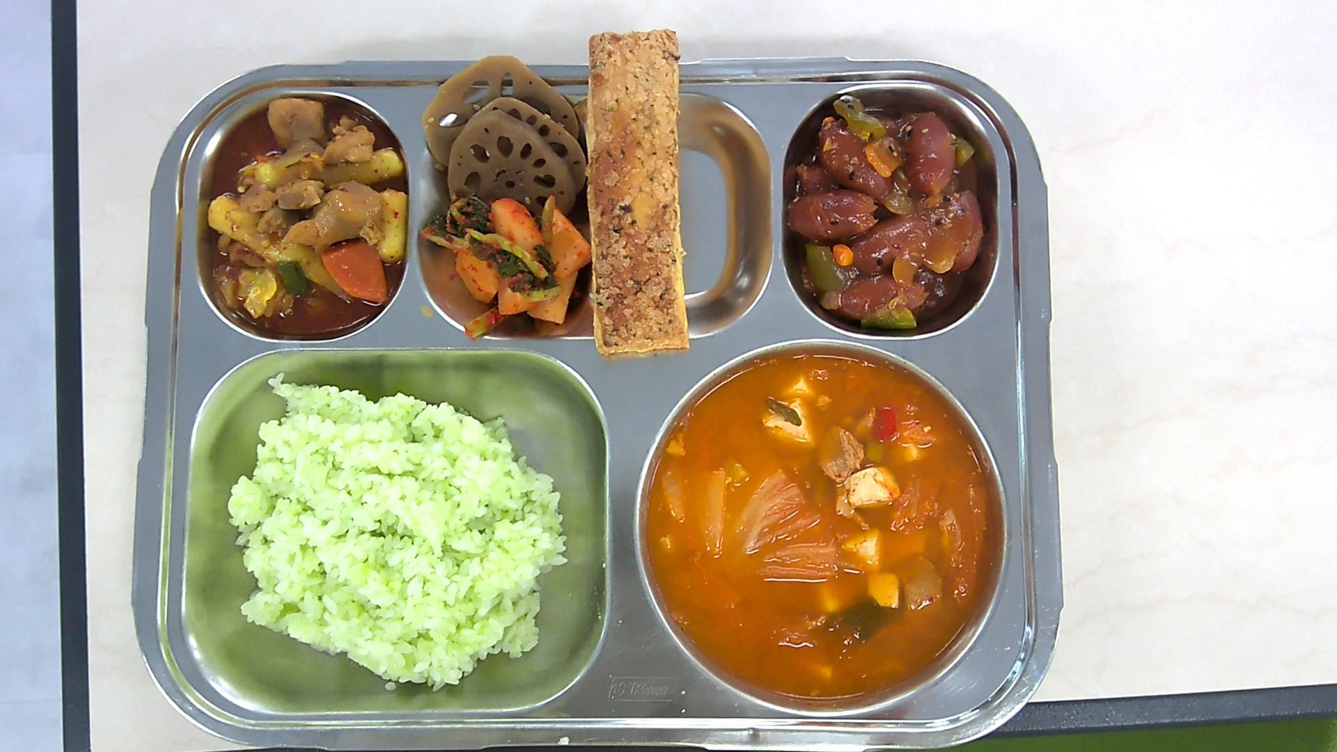 클로렐라잡곡밥* 돈육김치찌개* (5.9.10)마라찜닭*중 (5.6.13.15.18)연근조림-중 (5.6.13)소시지야채볶음*중 (2.5.6.10.12.13.15.16)총각김치* (9)갈릭파이*중 (1.2.5.6)