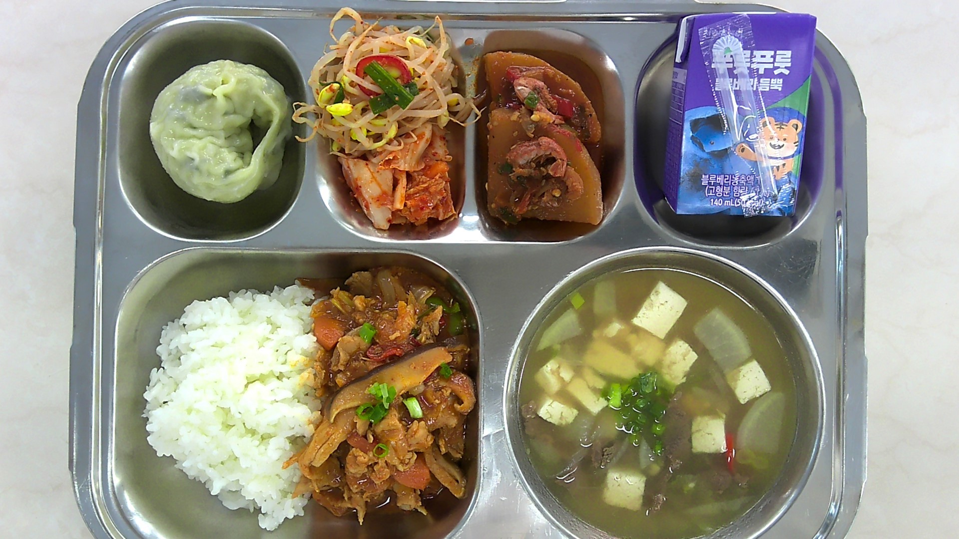 제육채소덮밥*중 (5.6.10.13)두부탕국 (5.16)건새우무조림(자율) (5.6.9.13)콩나물무침 (5)배추김치 (9)찐만두(70)/초간장*중 (1.5.6.10.13.16.18)블루베리주스 (13)