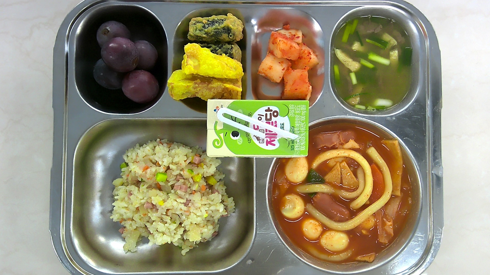 굴소스볶음밥 (1.2.5.6.10.13.15.16.18)가쓰오장국 (5.6.16)국물떡볶이(국칸) (1.2.5.6.10.13.15.16.18)고구마튀김 (5.6)김말이튀김 (1.5.6.16)깍두기 (9)청포도주스 (13)거봉
