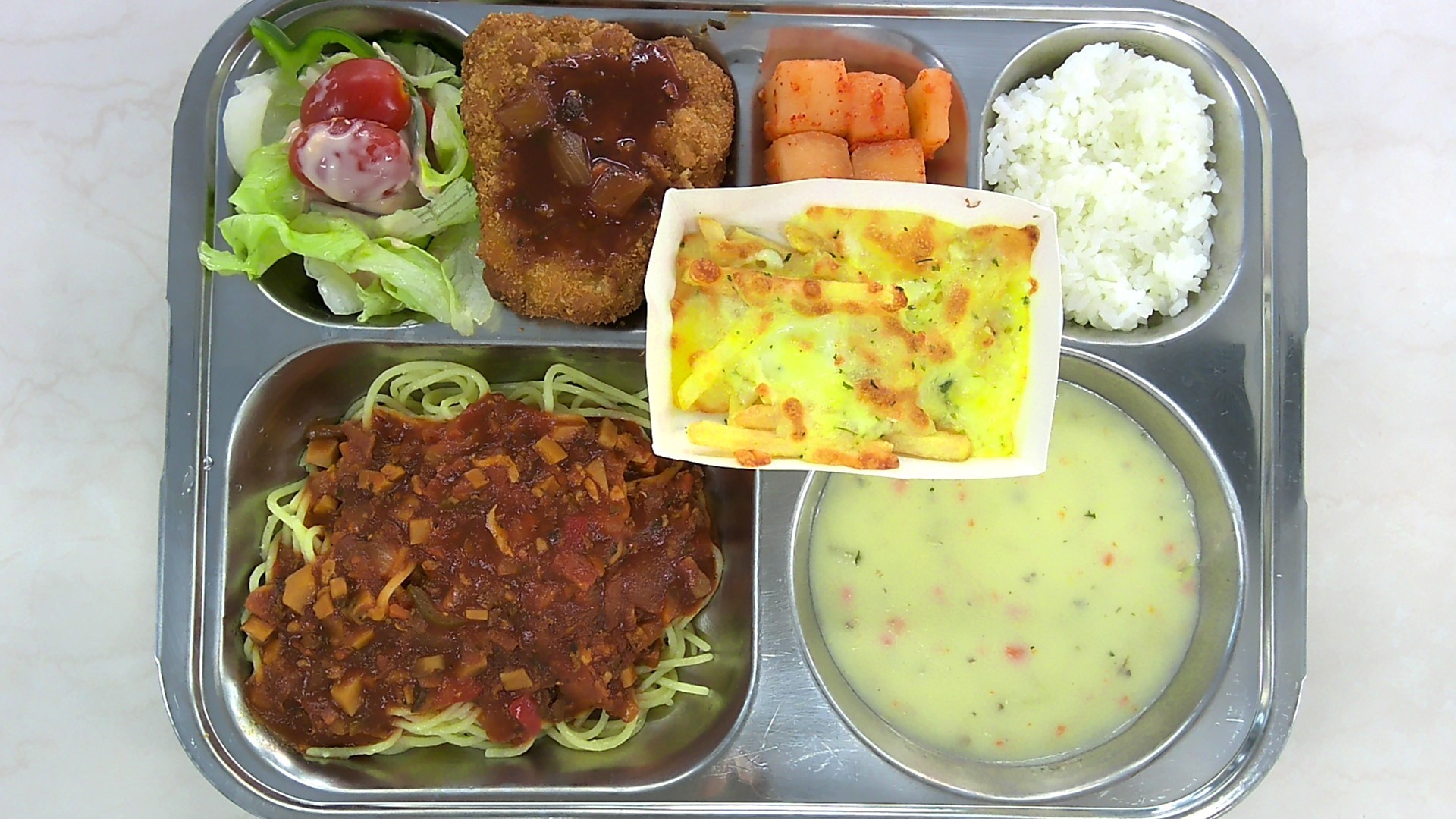 적은밥/중 크림스프* (2.5.6.13.16)양상추샐러드 (1.2.5.12)다시마채무침(자율) 스파게티(부식) (1.2.5.6.10.12.13.15.16)경양식돈가스-중 (1.2.5.6.10.12.13.16.18)오지치즈후라이 (5.6)깍두기 (9)