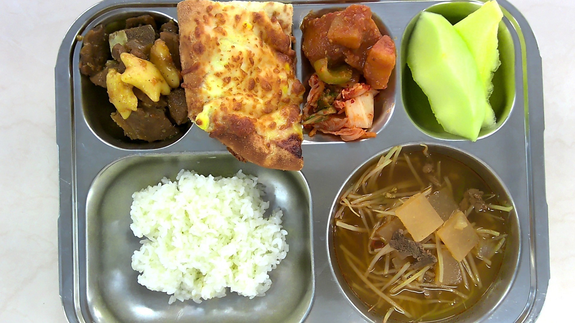 찹쌀밥 쇠고기국*중 (5.6.16)돼지갈비떡조림* (5.6.10.13)감자조림*중 (13)배추김치 (9)수제 치즈피자1/4(고피자)*중 (1.2.5.6.10.12.13.15.16)멜론