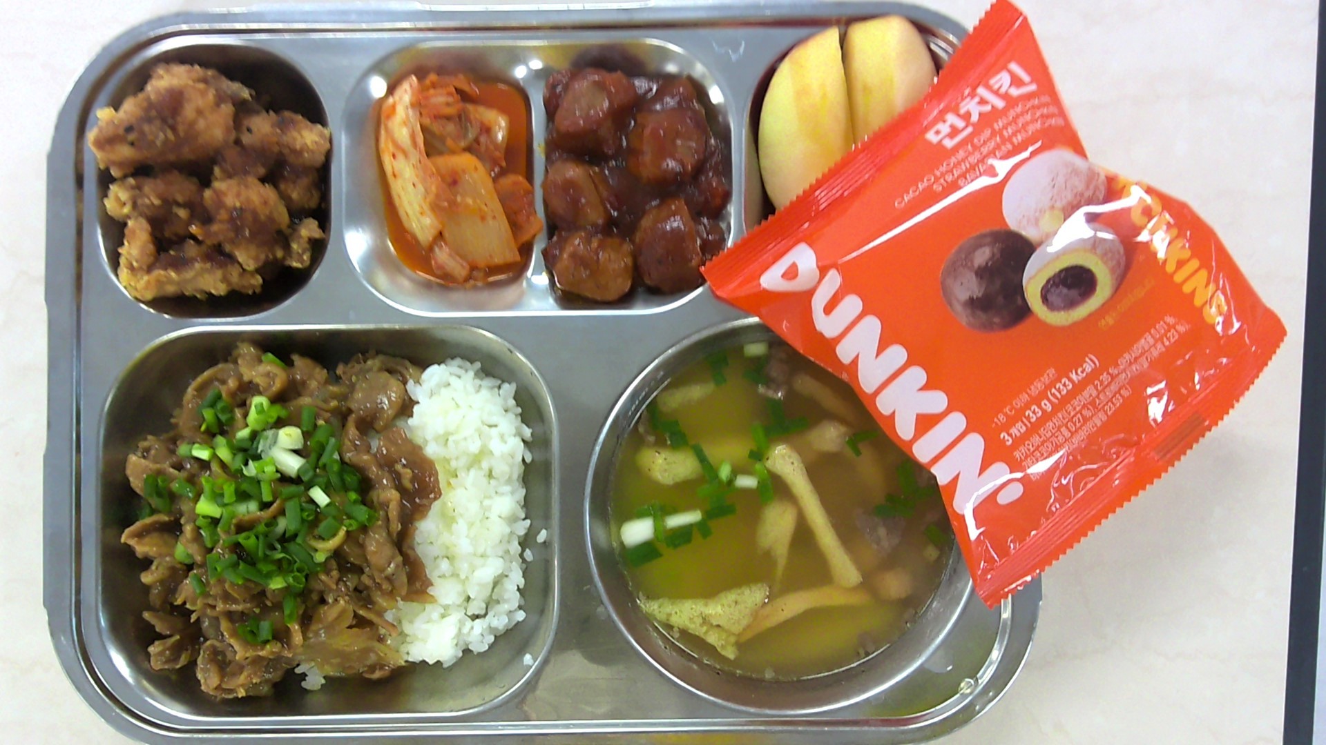 부타동(돼지고기덮밥)*중 (10)가쓰오장국 (5.6.16)미트볼조림-중 (1.2.5.6.10.12.13.15.16)수원왕갈비맛치킨 (5.6.12.13.15)배추김치 (9)도넛(먼치킨3종) (1.2.5.6)사과(부사)