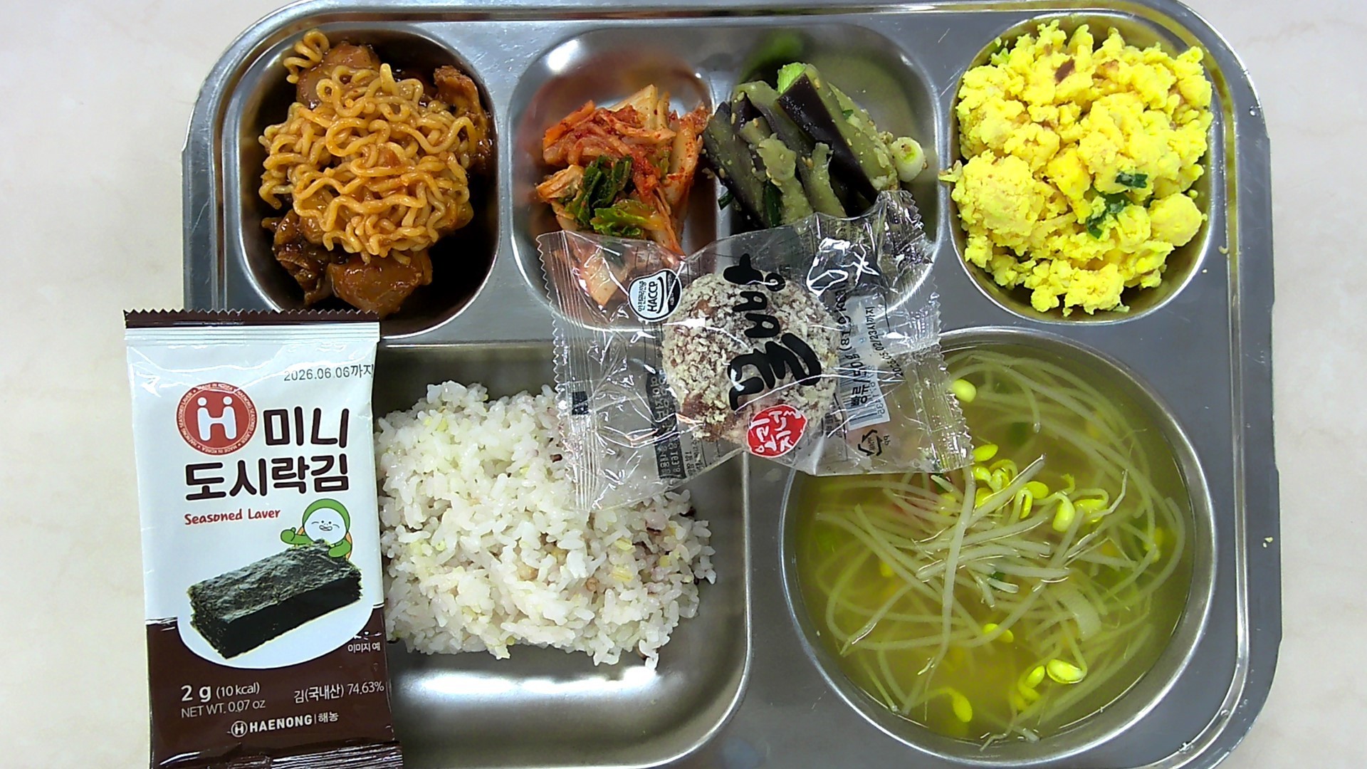 혼합잡곡밥* (5)맑은콩나물국*중 (5)가지나물*(자율) (5.6)에그스크램블* (1.2)숯불맛치킨-중 (1.5.6.12.13.15)김구이 배추김치 (9)통영식꿀빵-중 (1.2.5.6