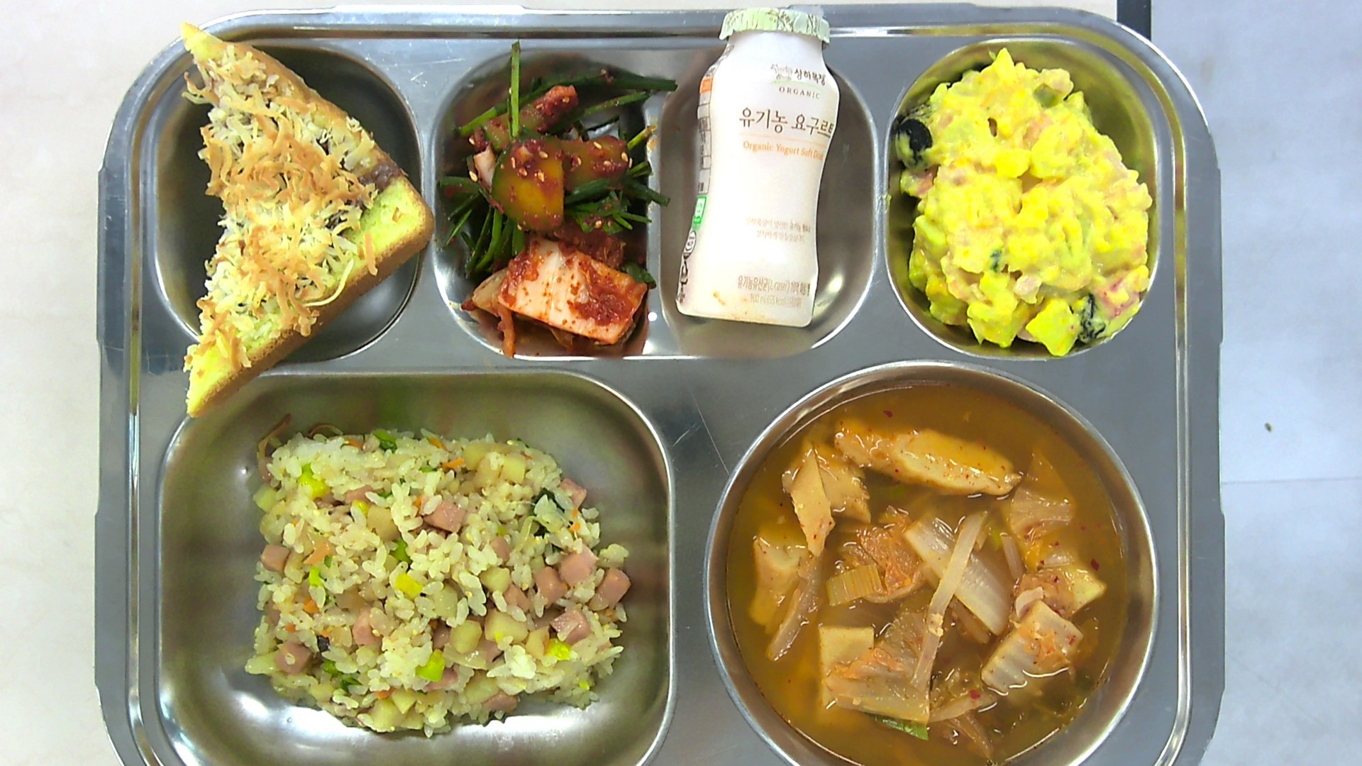 굴소스볶음밥 (1.2.5.6.10.13.15.16.18)김치어묵국* (1.5.6.9)고구마단호박샐러드* (1.2.5.6.10.15.16)오이부추무침*중 (13)배추김치 (9)유기농요구르트 (2)누텔라코코넛토스트 (2.5.6)