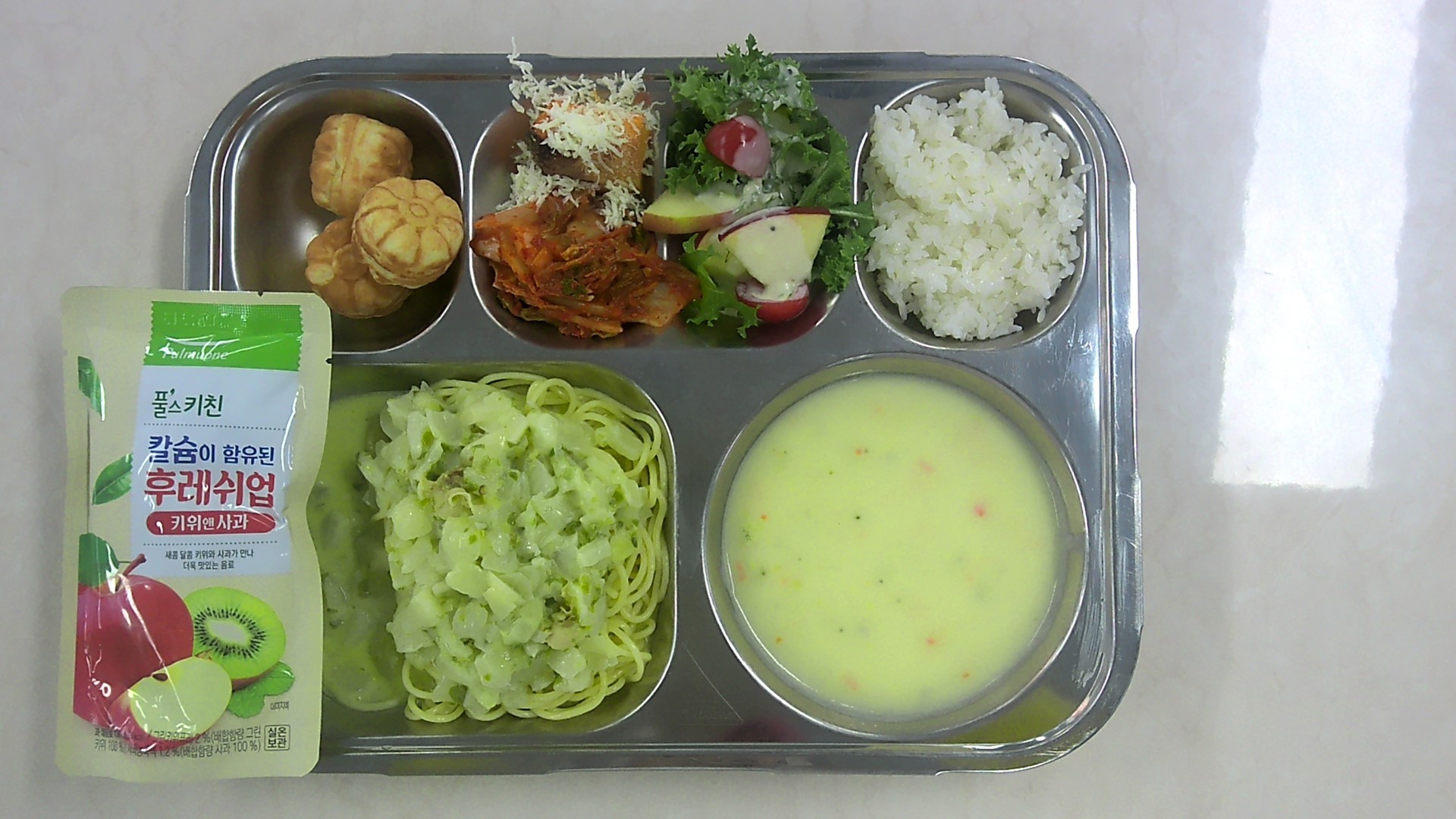 쌀밥(자율) 가리비봉골레파스타 (1.2.5.6.13.18)고구마크림스프 (2.5.6.13.16)치커리과일샐러드&키위소스 (1.5.12.13)단호박치즈구이 (2.13)배추김치 (9)주스8 (13)국화빵 (1.2.5.6)
