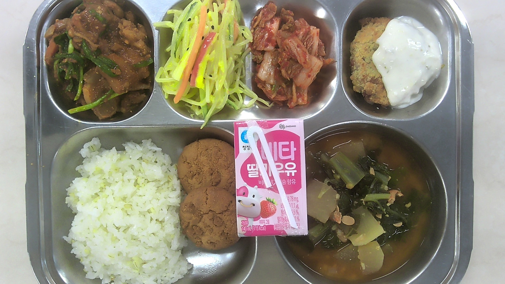 보리밥 근대된장국 중 (5.6)시래기돼지갈비찜-중 (5.6.10.13)콩나물겨자냉채* (1.2.5.6.13)오징어까스-중 (1.5.6.13.17)배추김치 (9)딸기우유 (2)초코칩쿠키 (1.2.5.6)