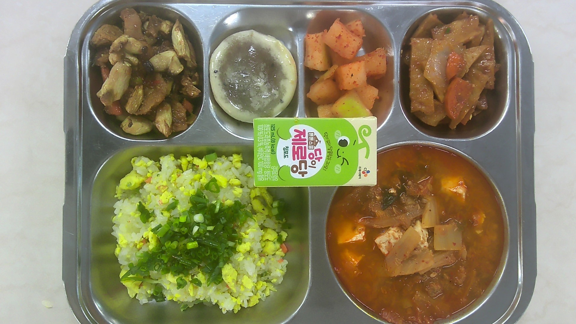 간장계란밥(다채롭6-초) (1.2.5.6.13)참치김치찌개*중 (5.6.9.16.18)갈비양념돈육구이*중 (5.6.10.13)사각어묵볶음*중 (1.5.6)깍두기 (9)청포도주스 (13)씨앗호떡 (1.2.5.6)
