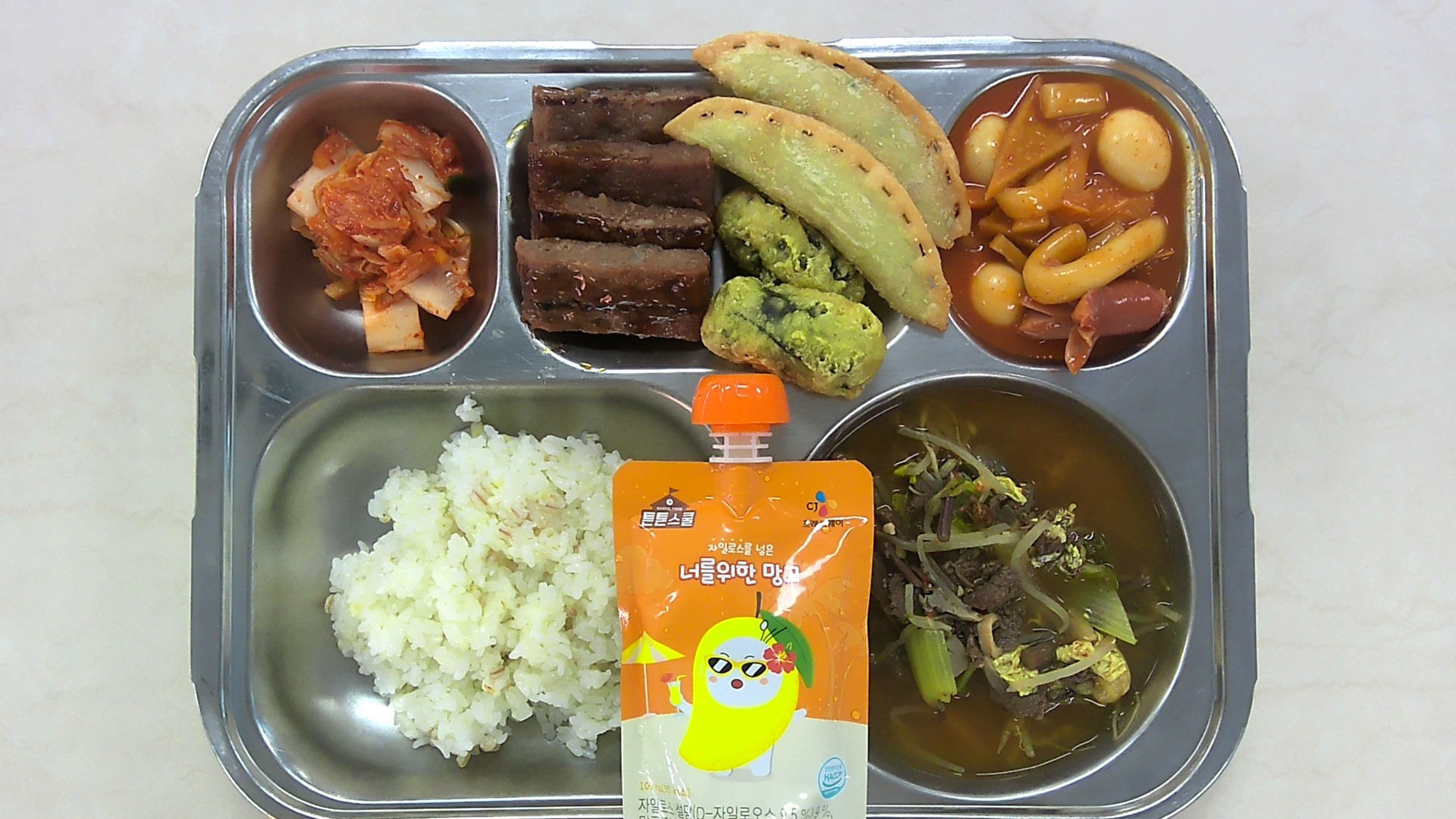 통밀쌀밥* (6)한우육개장 (1.16)국물떡볶이(국칸) (1.2.5.6.10.13.15.16.18)김말이튀김 (1.5.6.16)떡갈비/데리소스* (5.6.10.13.15.16.18)군만두 (1.5.6.10.16.18)배추김치 (9)주스4 (13)